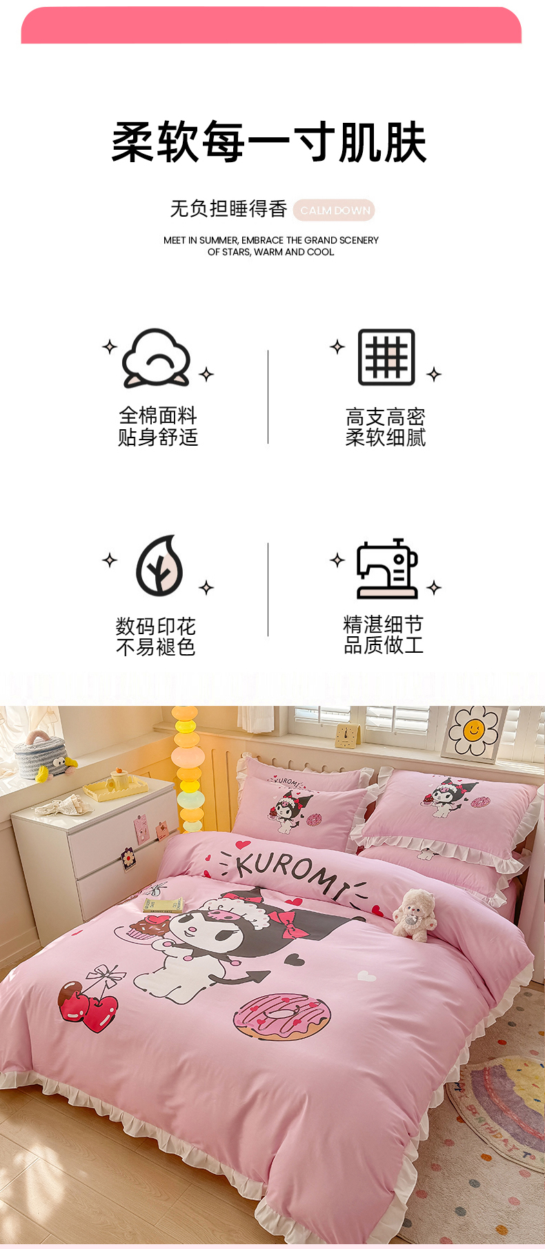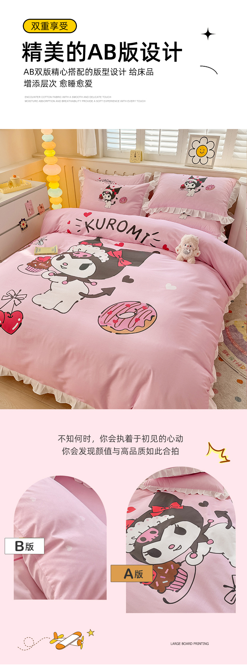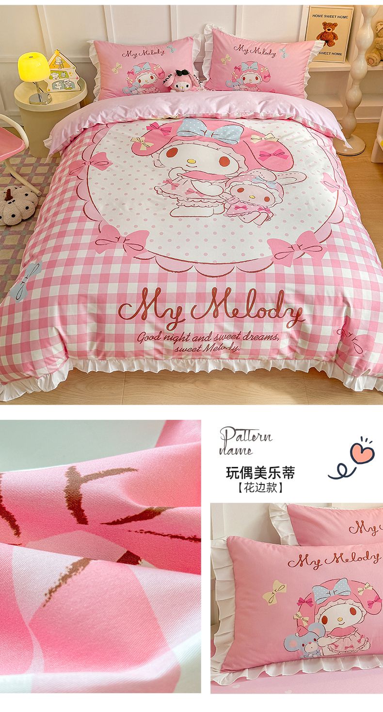 当前位置: 91家纺网 > 商品网购 > 床品套件 > 四件套 > 全棉普通四件套 > 玉元坊 2025新款三丽鸥白花边被套数码印花大版全棉纯棉卡通三四件套 花边款-美味库洛米