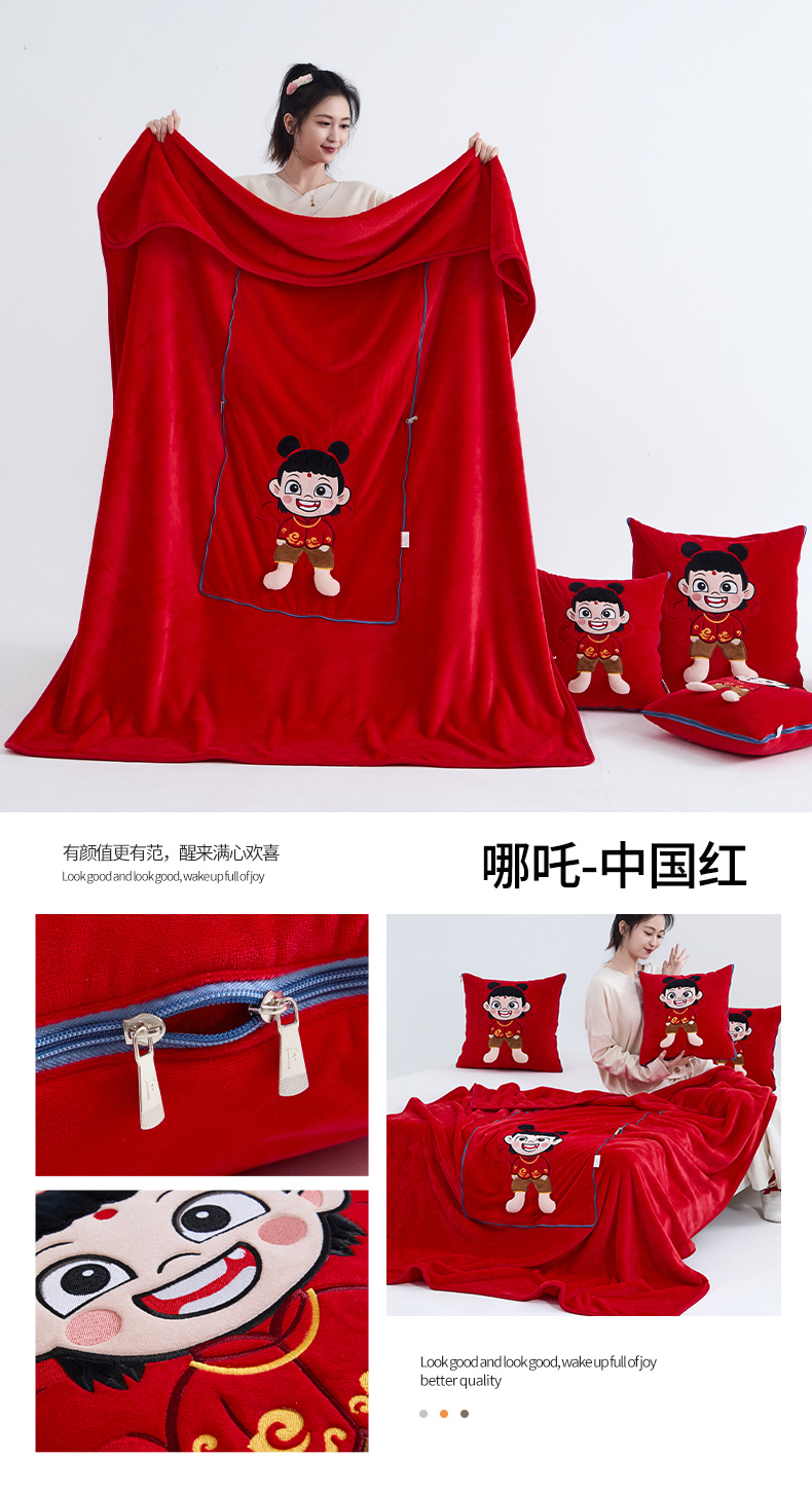 商品名称:吉利家居 2025新款法莱绒贴布立体刺绣抱枕毯 哪吒-中国红