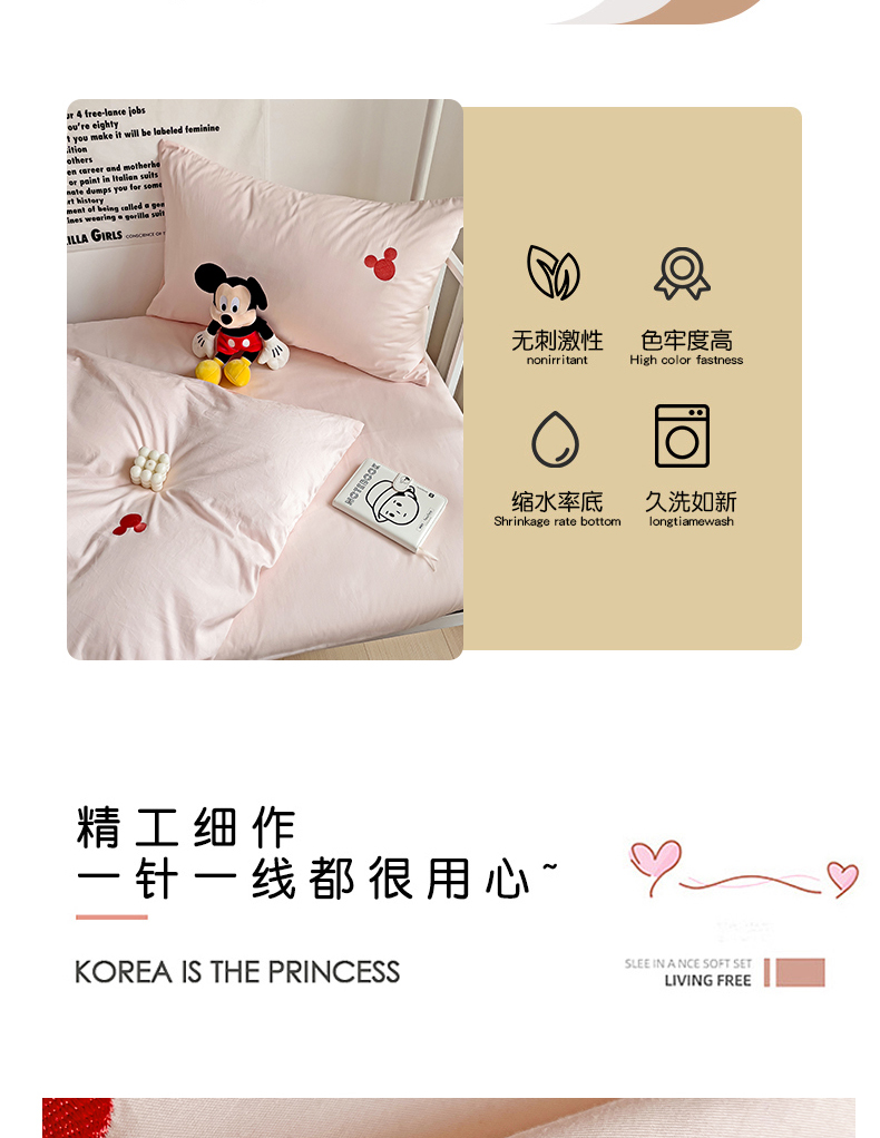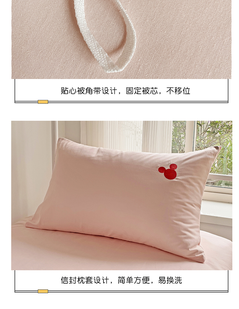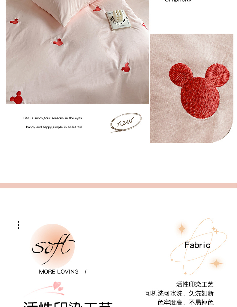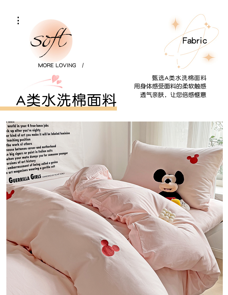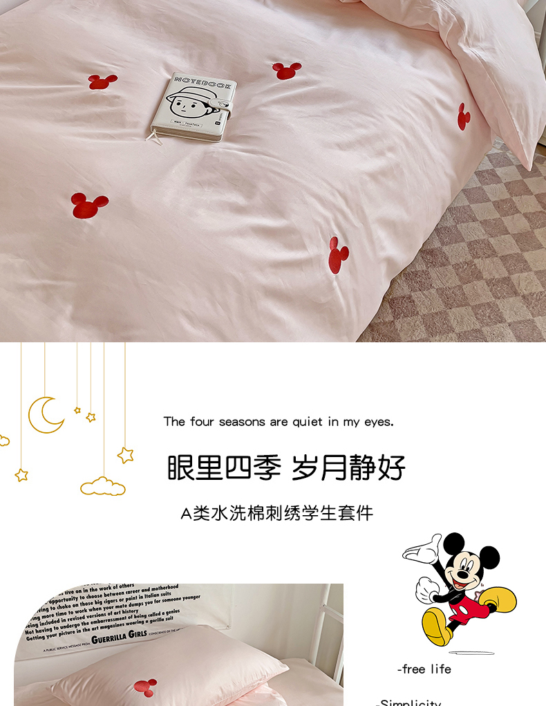 静家居-简约原创家纺 2025新款40sA类水洗棉米奇刺绣系列学生三件套 米奇粉