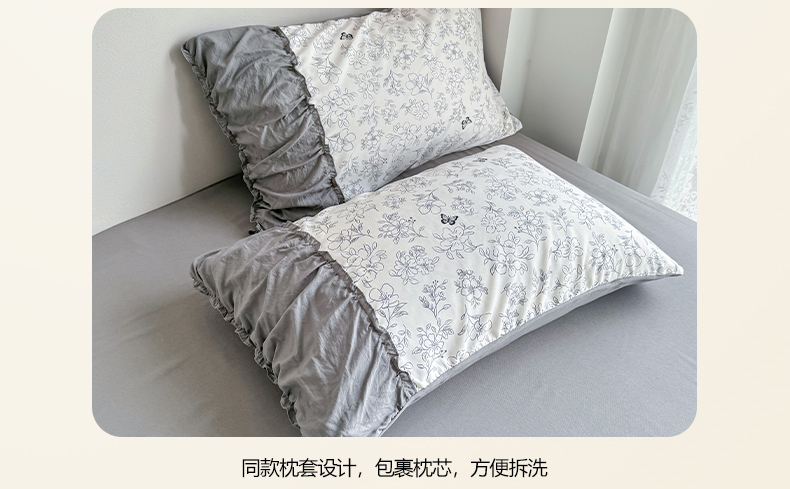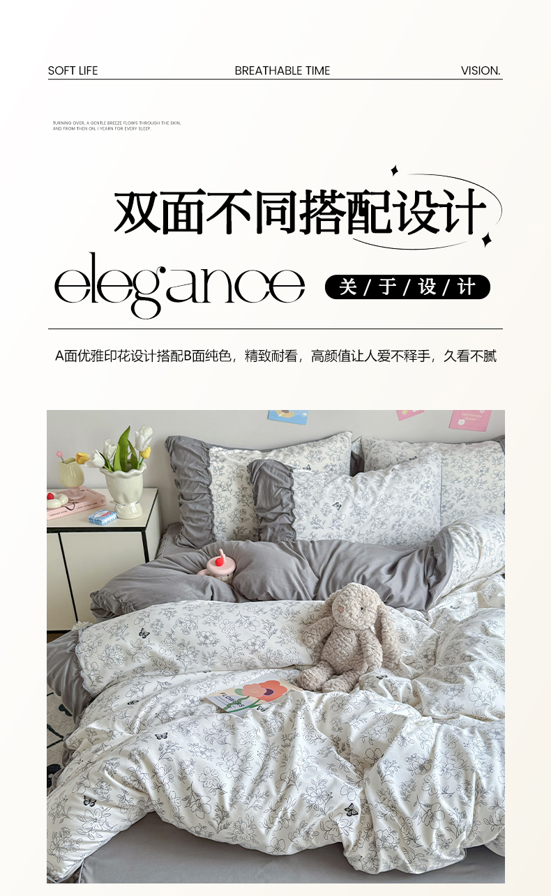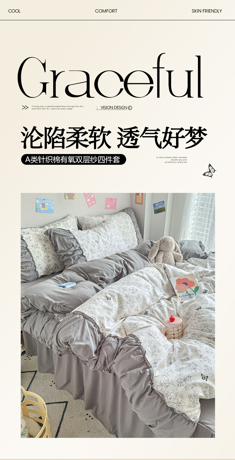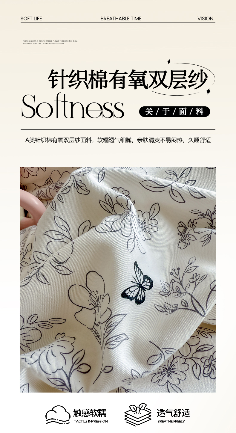 当前位置: 91家纺网 > 商品网购 > 床品套件 > 四件套 > 双层纱四件套 > 优卡迪家纺馆 2025新款A类针织棉有氧双层纱花边款四件套 梦蝶
