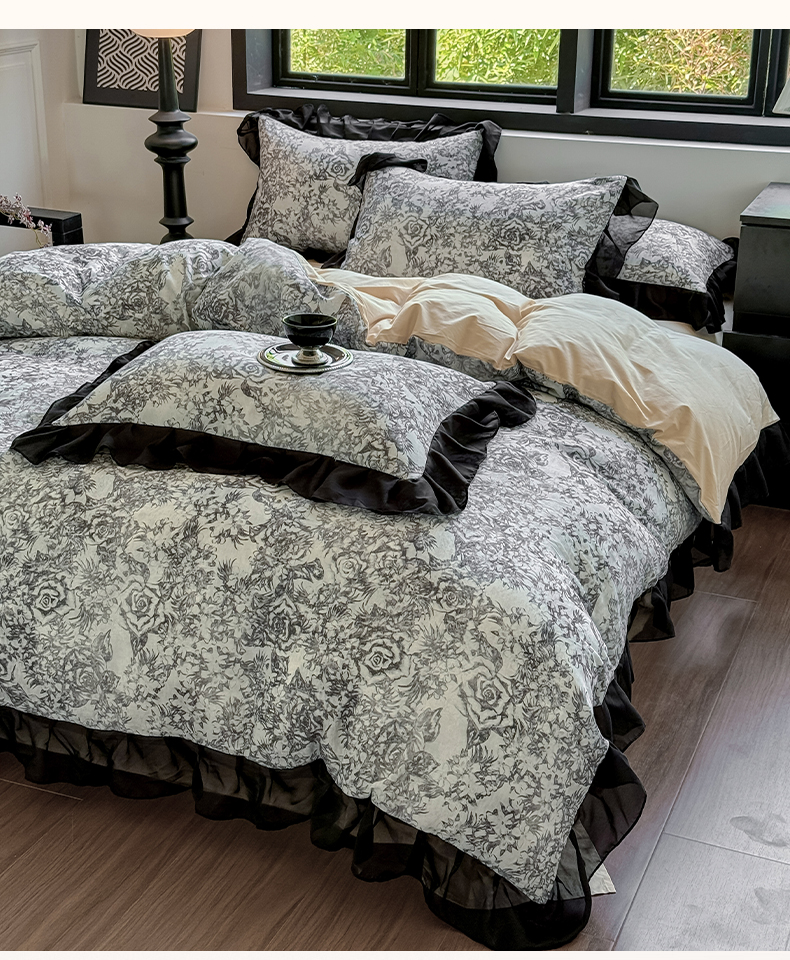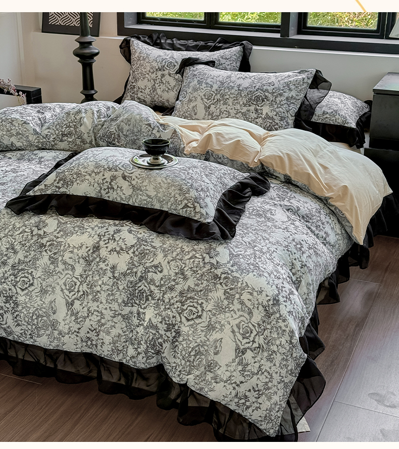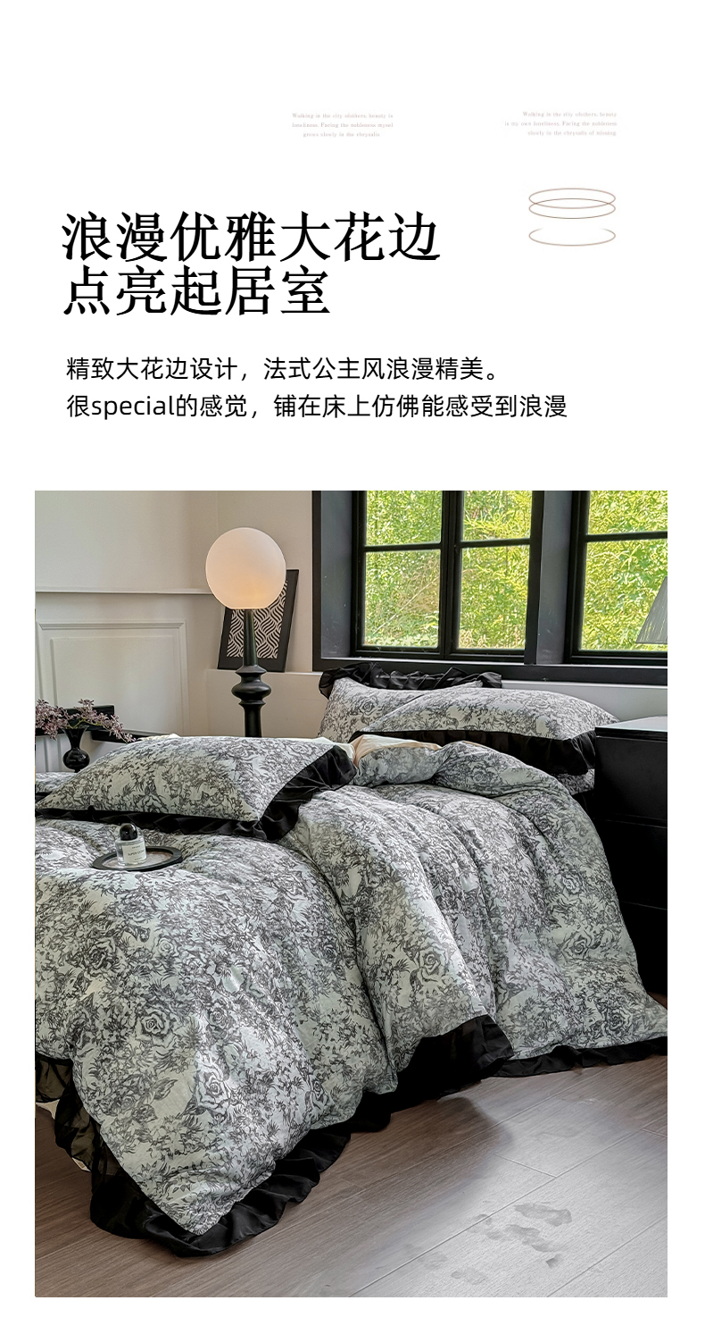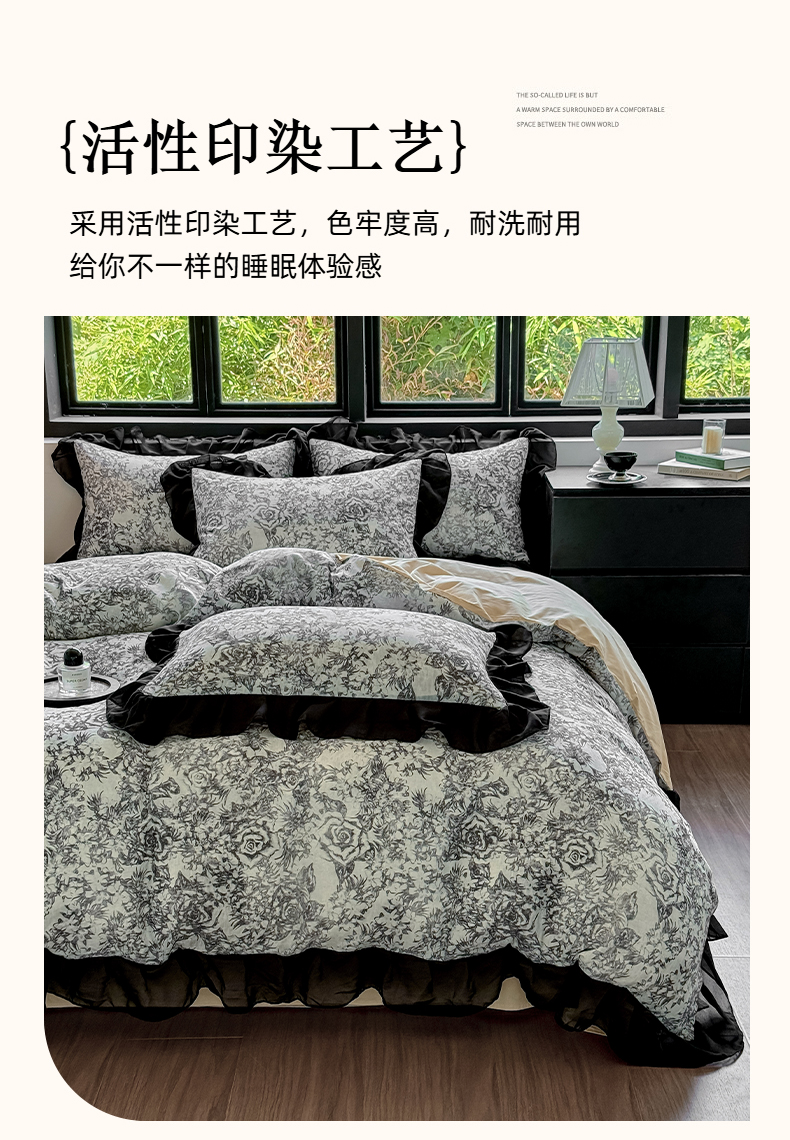 商品名称:宅家居 2025新款A类轻法式复古赫本风全棉纯棉有氧双层纱花边四件套黑色韩式花边三件套 莫奈