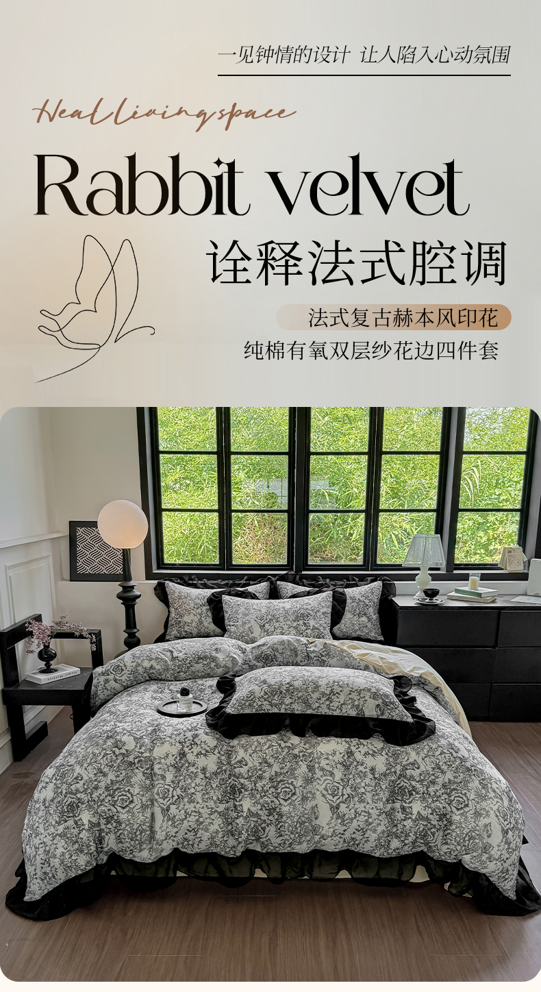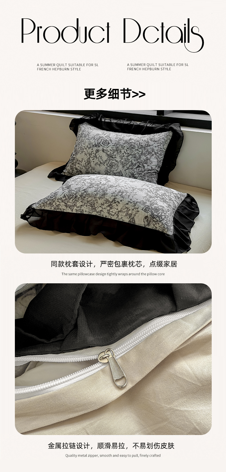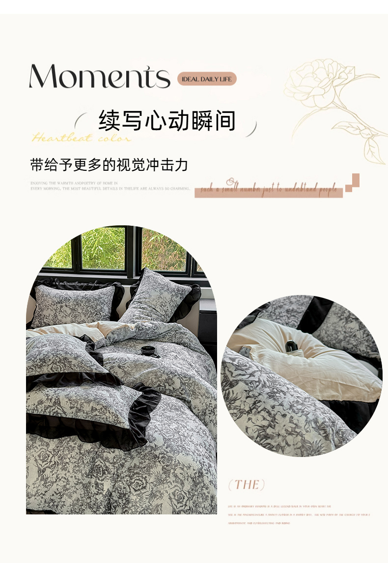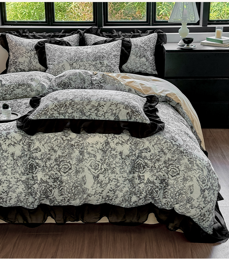 商品名称:宅家居 2025新款A类轻法式复古赫本风全棉纯棉有氧双层纱花边四件套黑色韩式花边三件套 莫奈