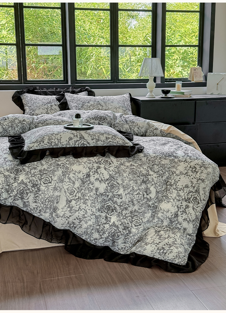 宅家居 2025新款A类轻法式复古赫本风全棉纯棉有氧双层纱花边四件套黑色韩式花边三件套 莫奈