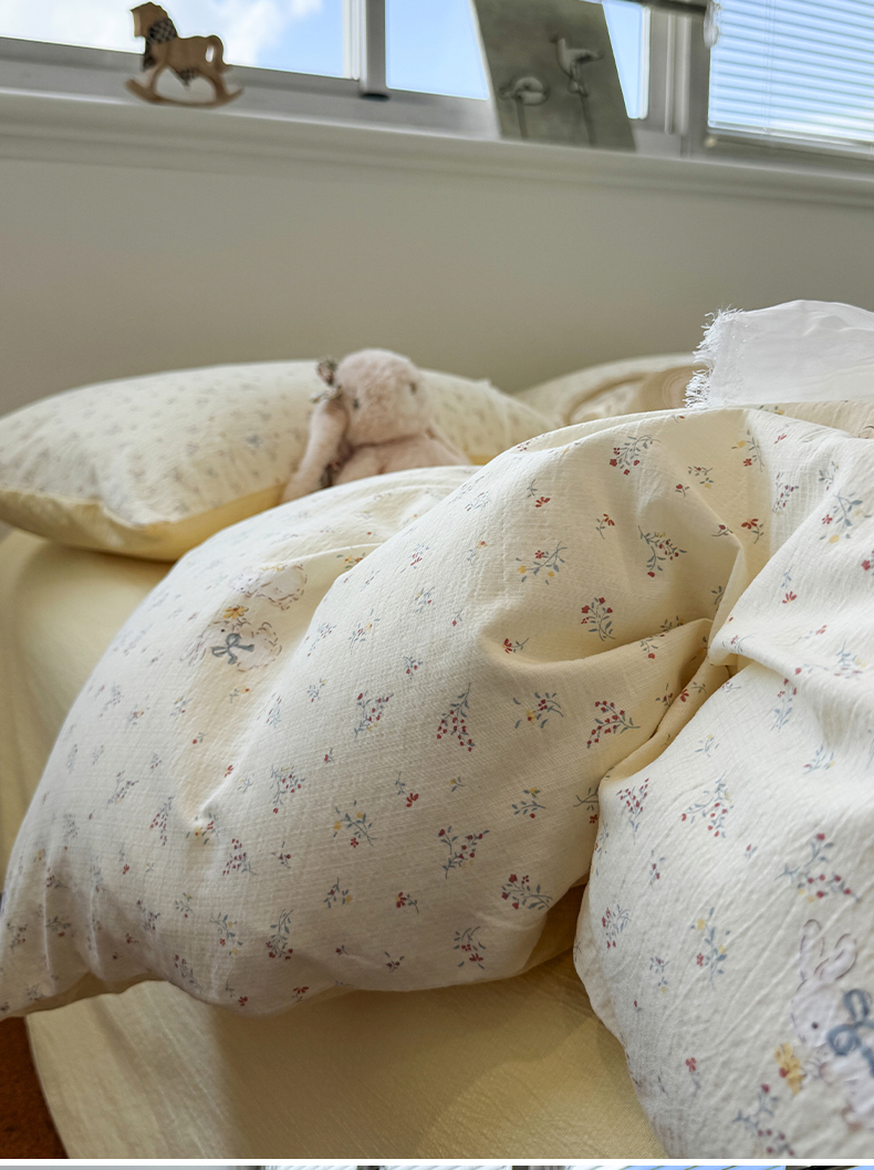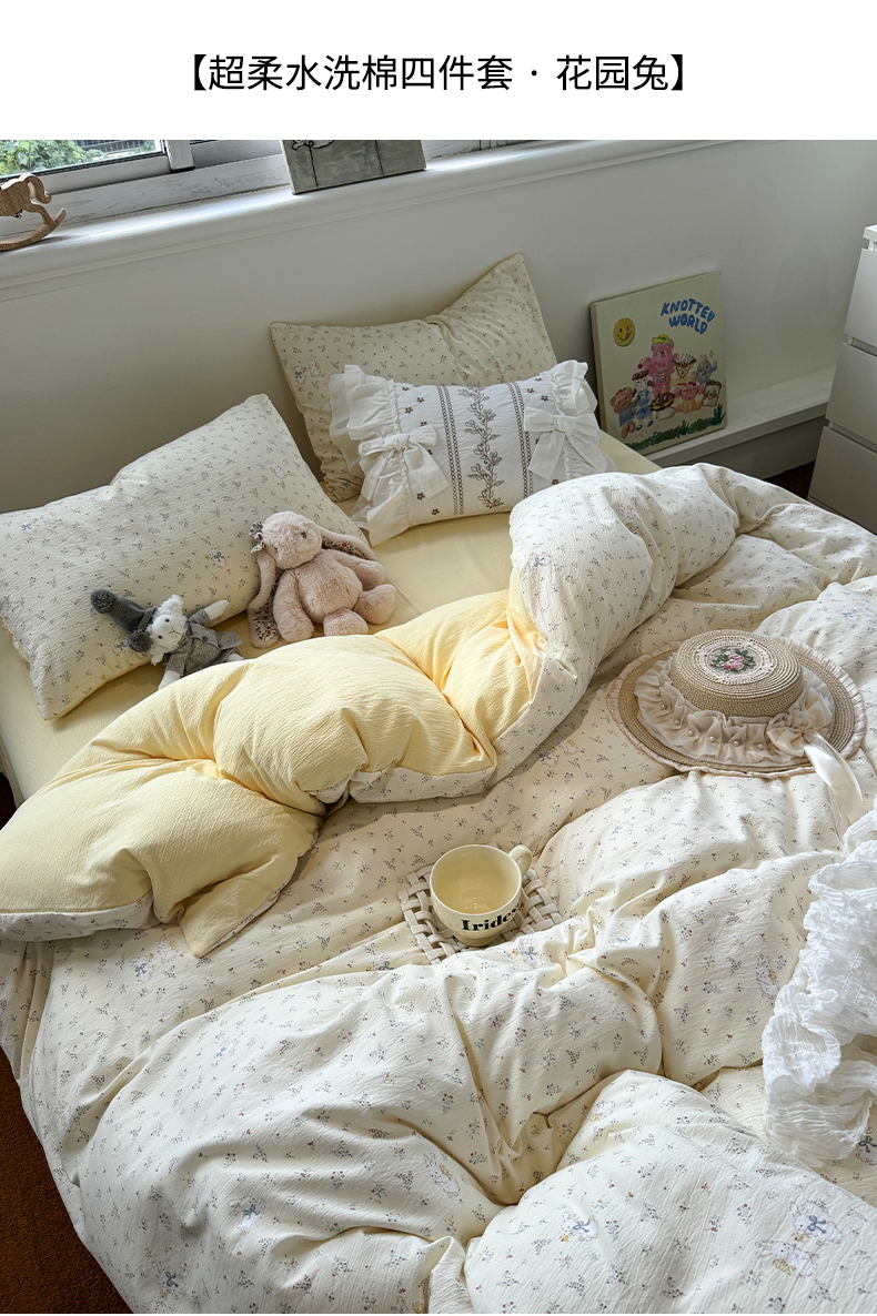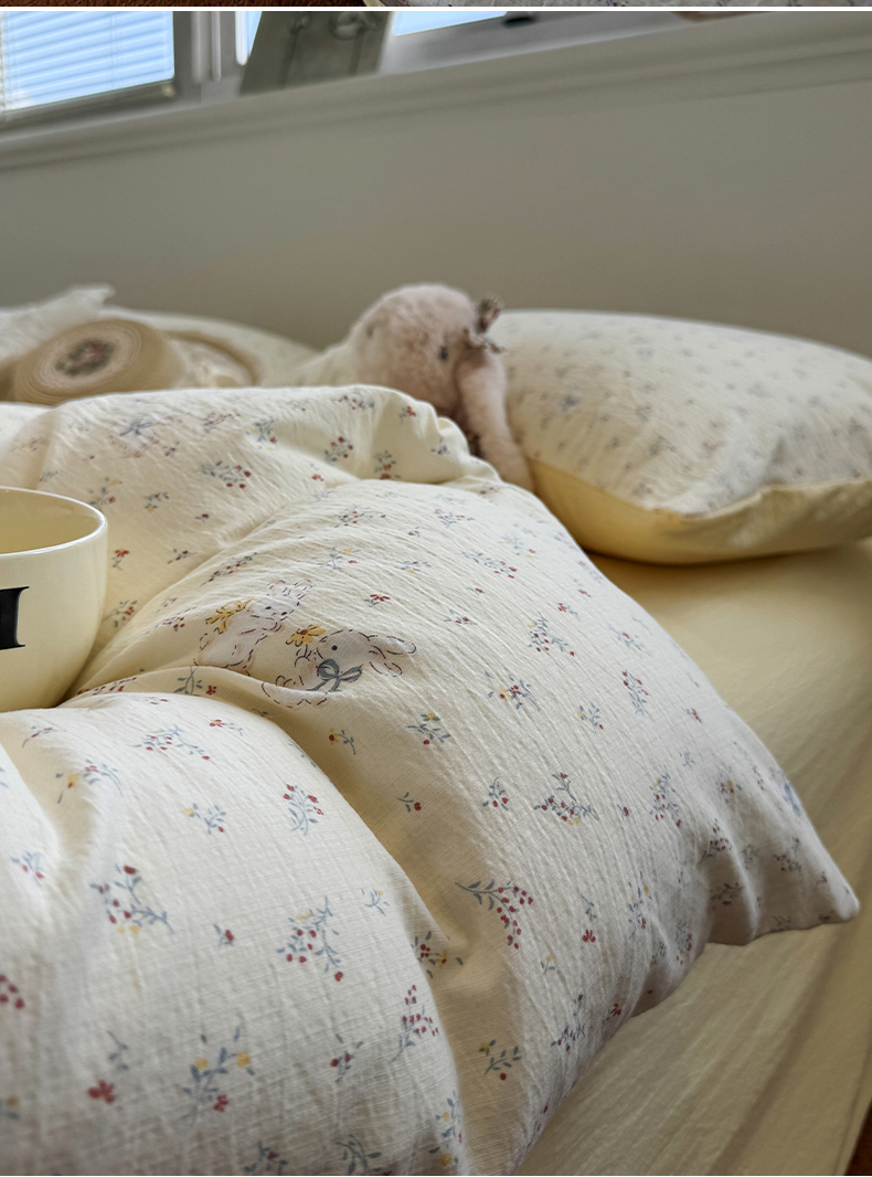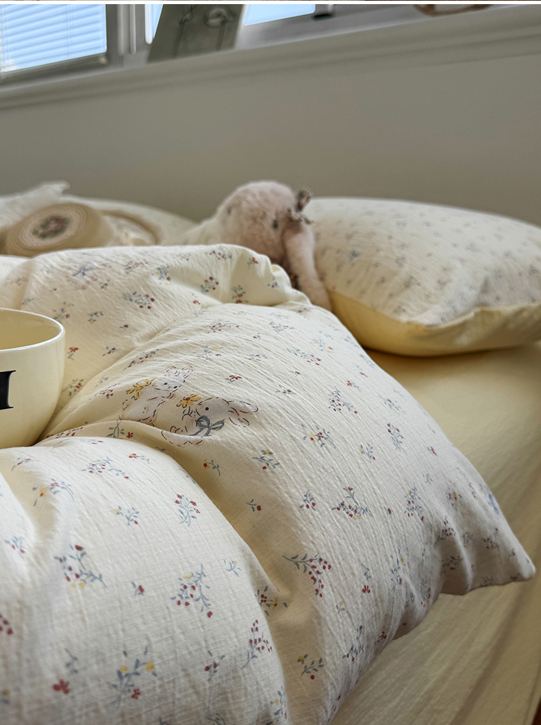 当前位置: 91家纺网 > 商品网购 > 床品套件 > 四件套 > 其它四件套 > 水墨江南 2025新款高克重云感双层纱印花四件套-场景二 花园兔