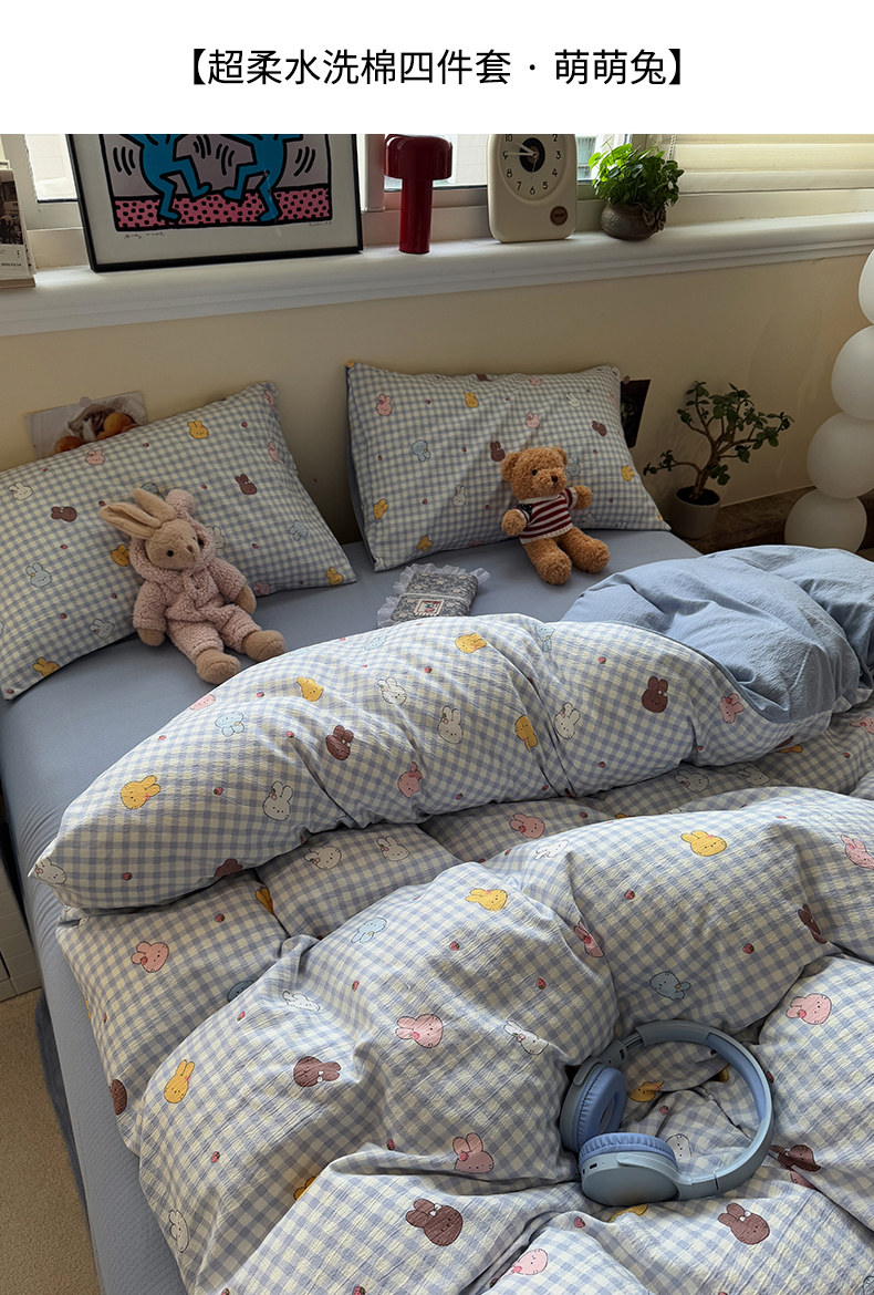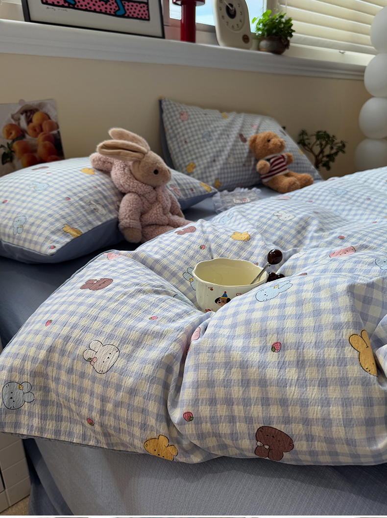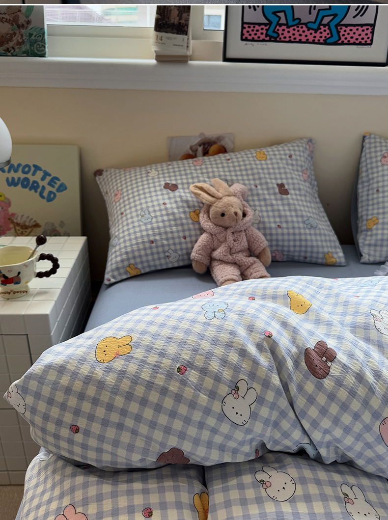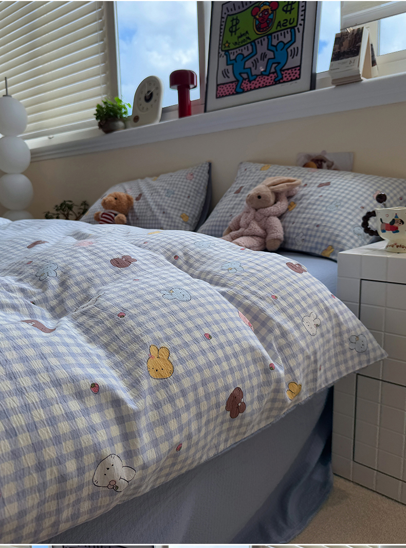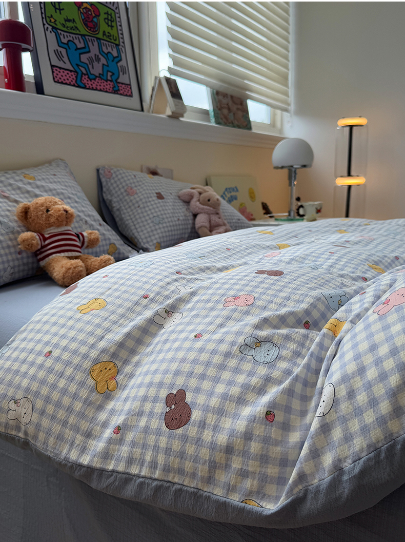 当前位置: 91家纺网 > 商品网购 > 床品套件 > 四件套 > 其它四件套 > 水墨江南 2025新款高克重云感双层纱印花四件套-场景二 萌萌兔
