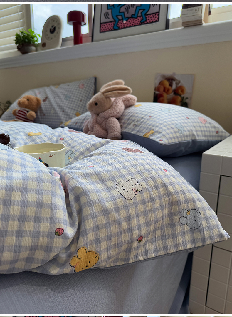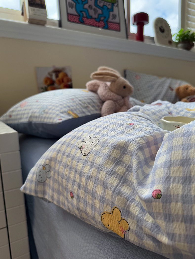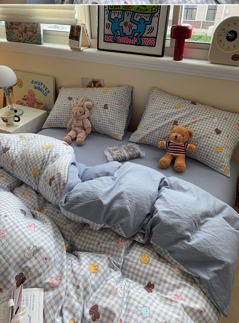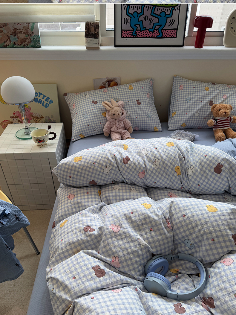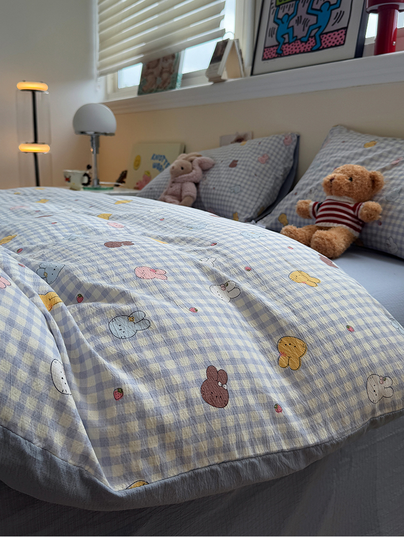 当前位置: 91家纺网 > 商品网购 > 床品套件 > 四件套 > 其它四件套 > 水墨江南 2025新款高克重云感双层纱印花四件套-场景二 萌萌兔