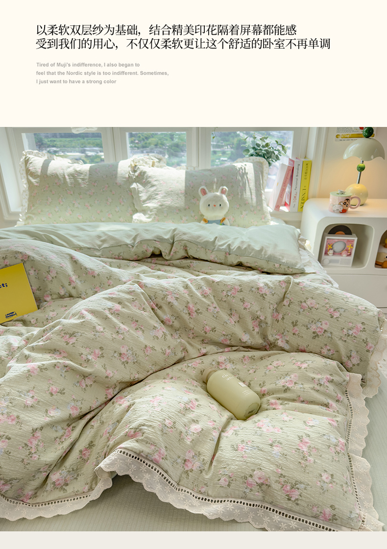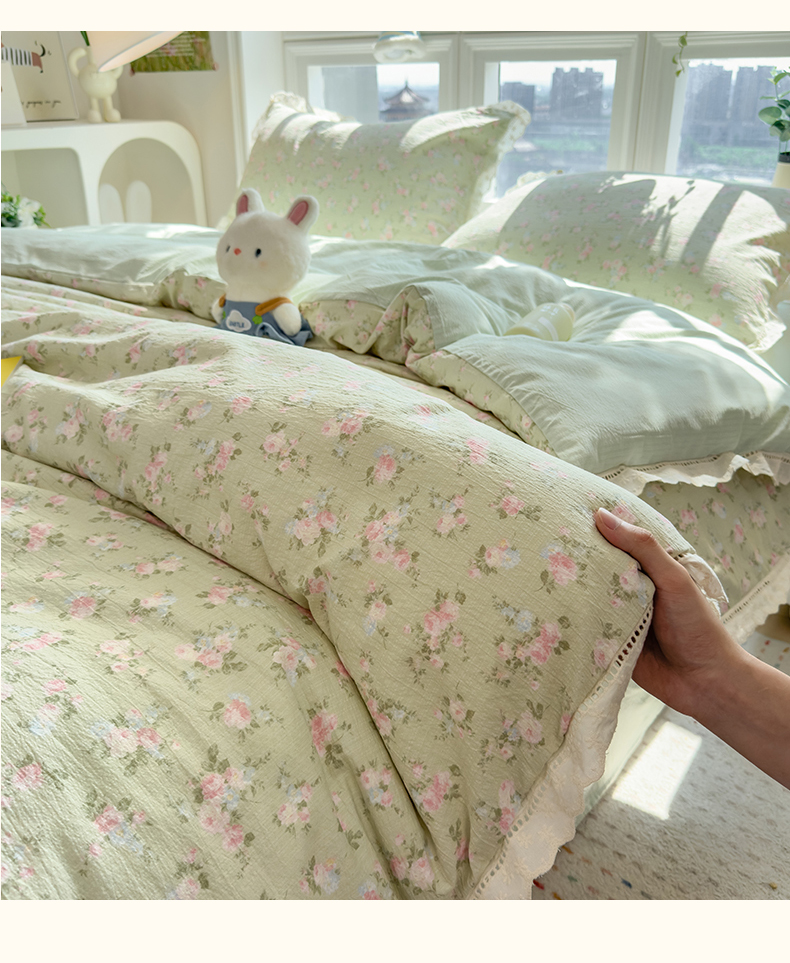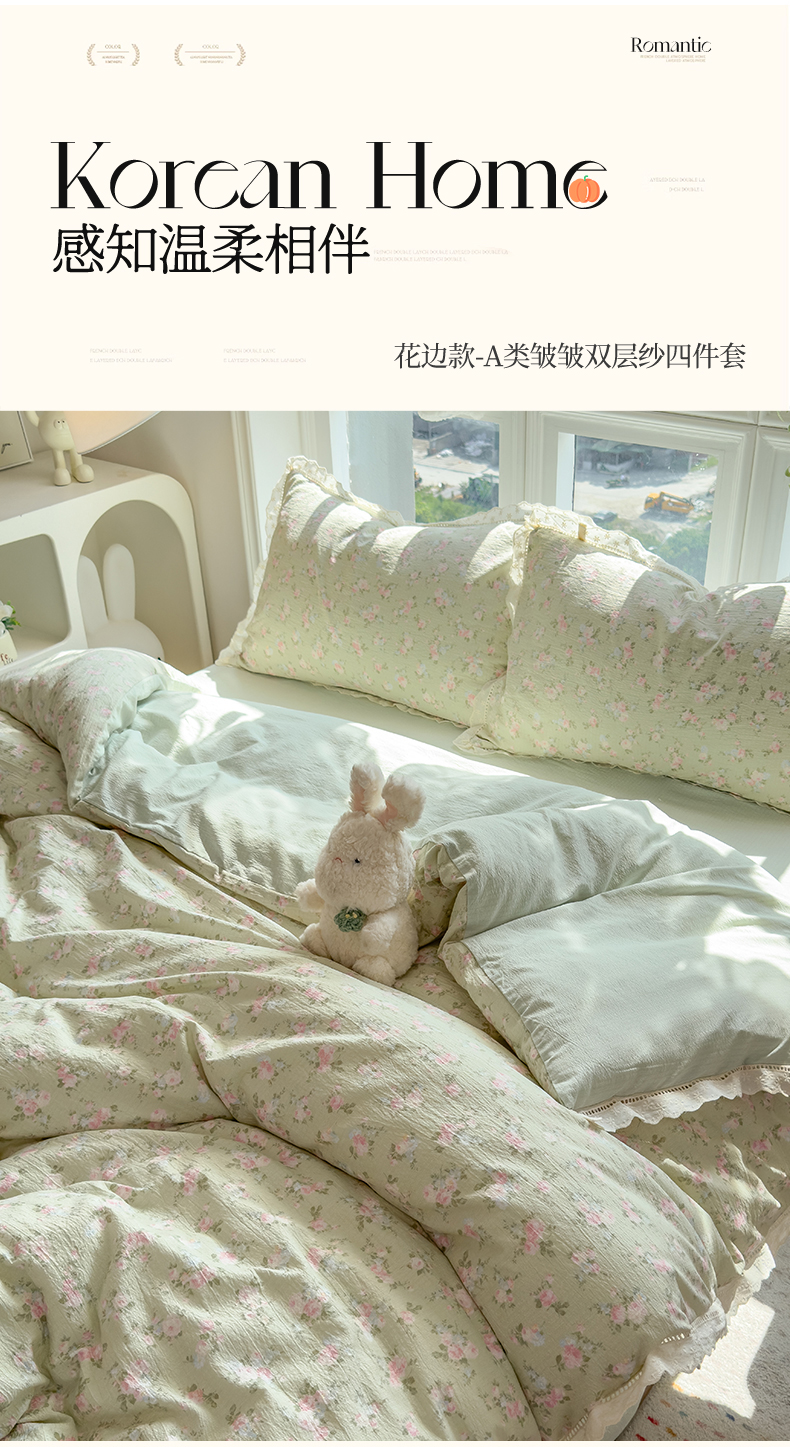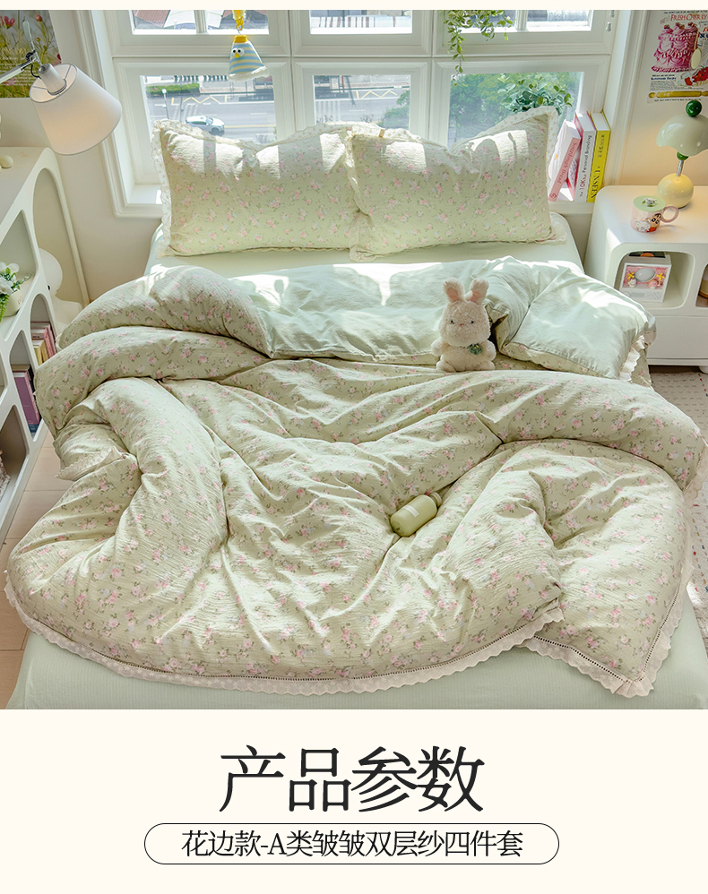 当前位置: 91家纺网 > 商品网购 > 床品套件 > 四件套 > 双层纱四件套 > 雯豆家纺2025新品皱皱双层纱四件套镂空花边款三件套 初夏