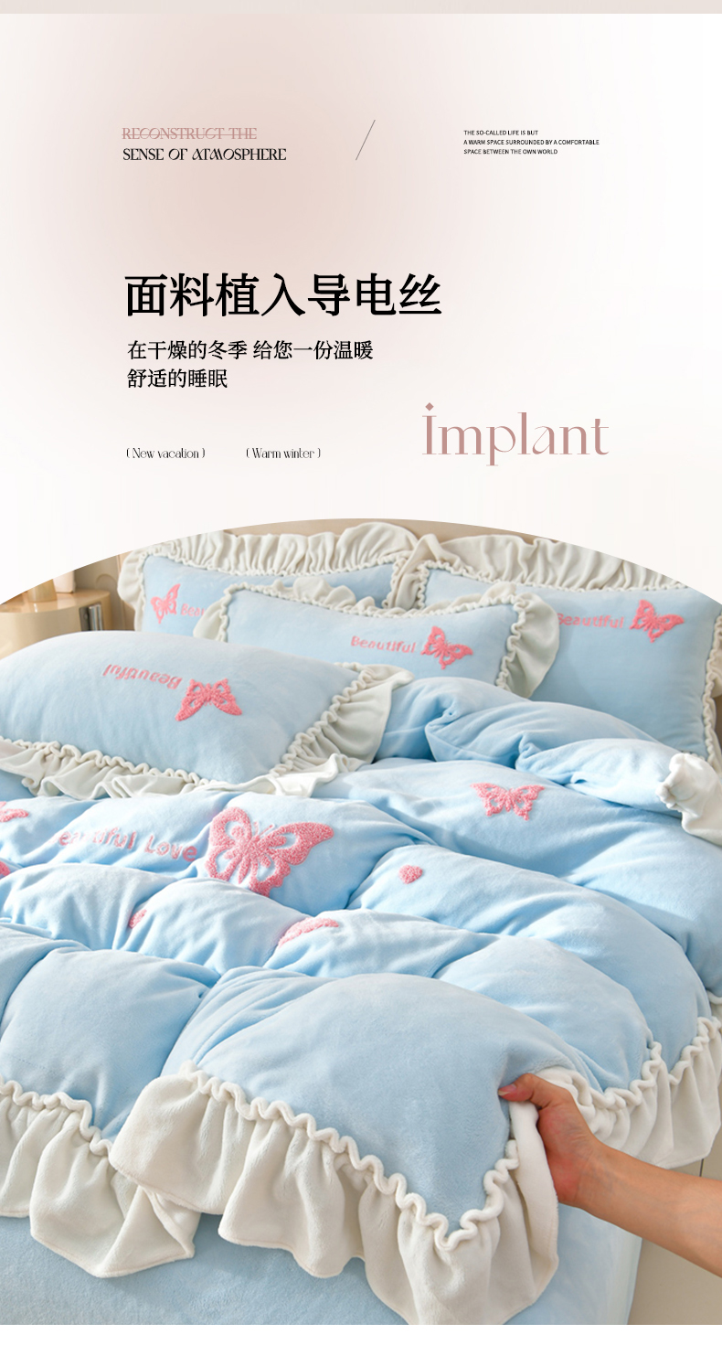 商品名称:梦之星 2025新款9斤毛巾绣韩式花边牛奶绒四件套 蝴蝶-天空蓝