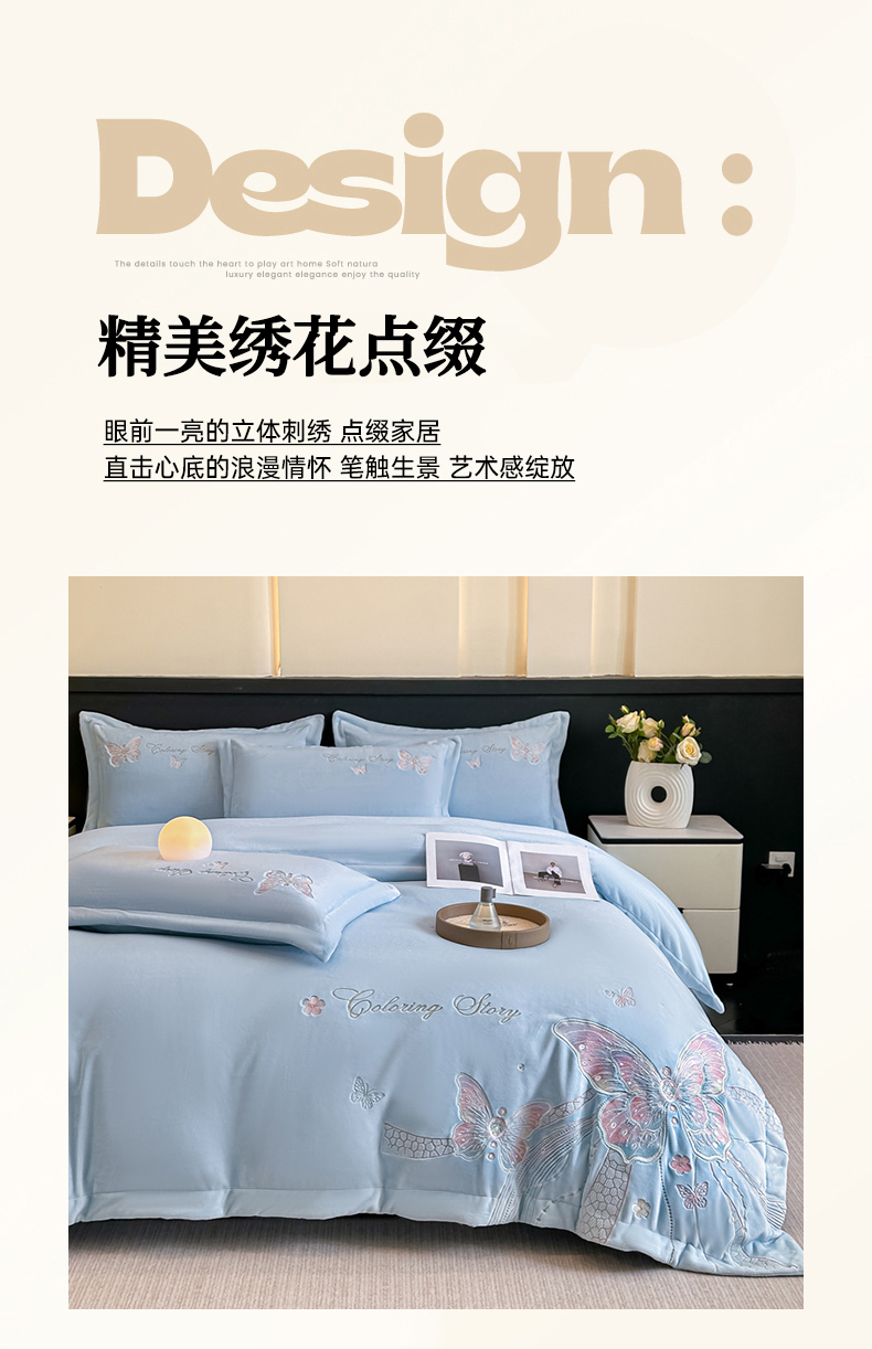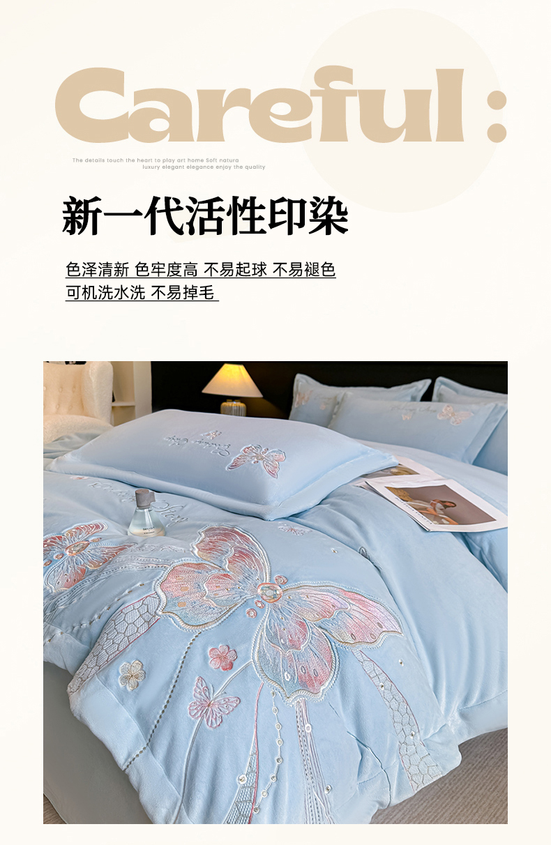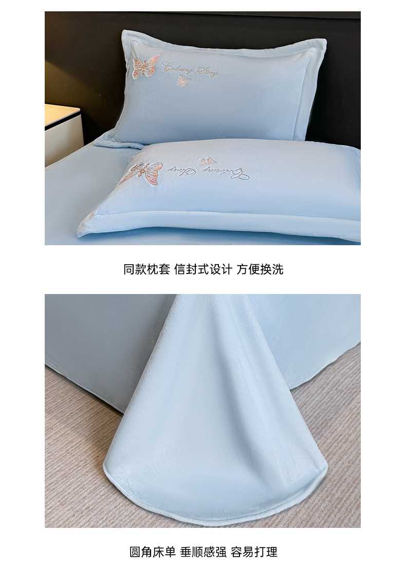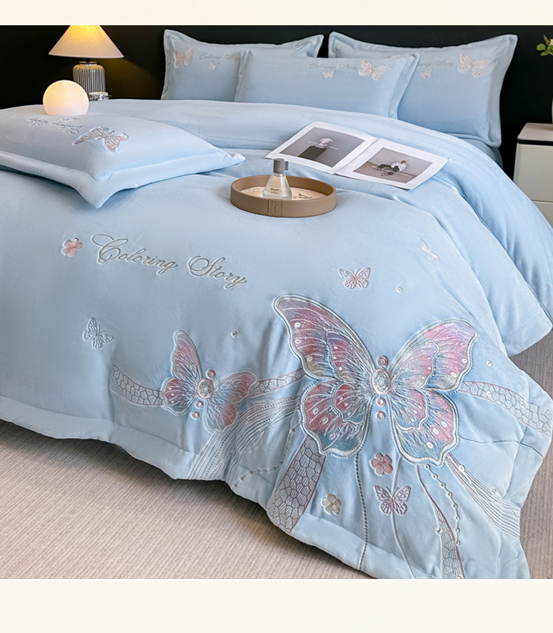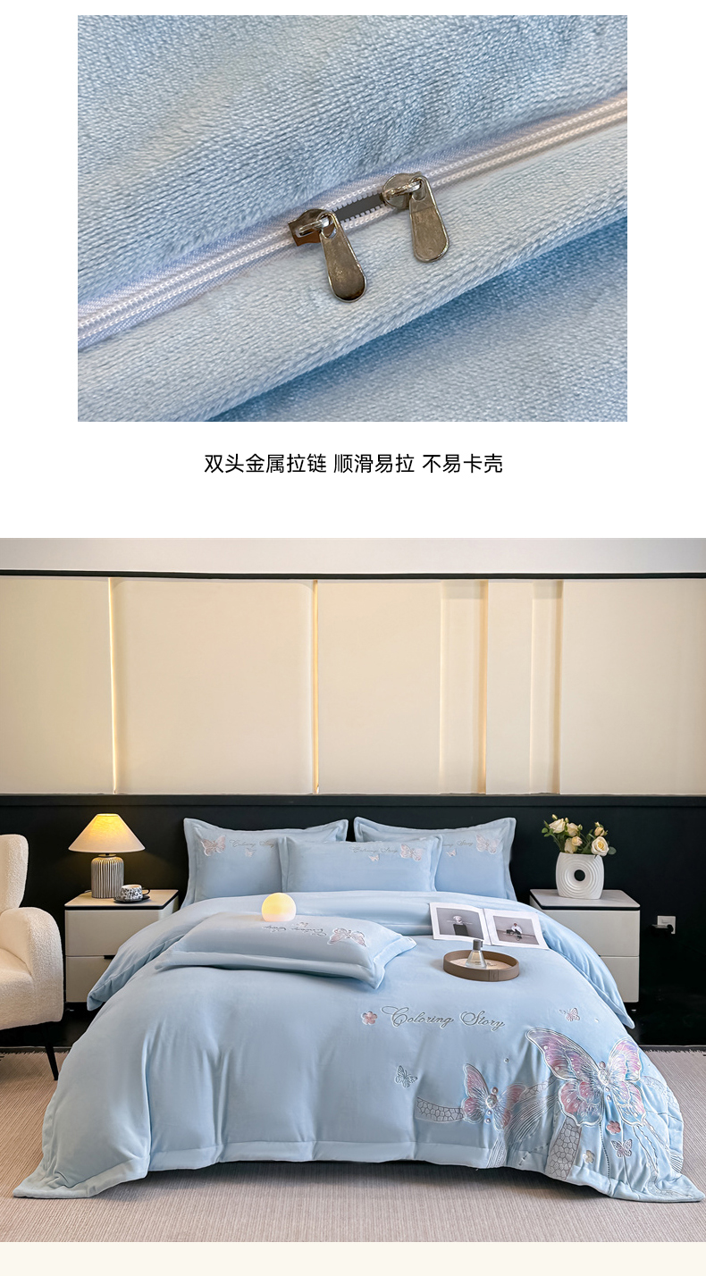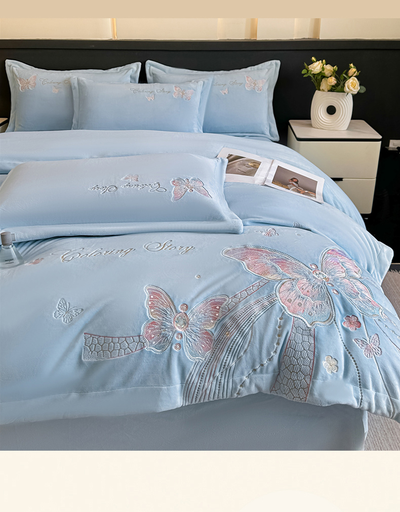 商品名称:锦铭源家纺 2025新款75D全消光超柔樱花绒绣花四件套牛奶绒四件套【有买家秀】 蝶恋-蓝