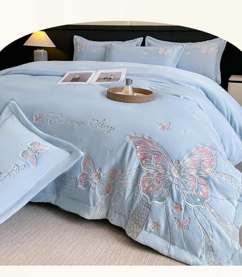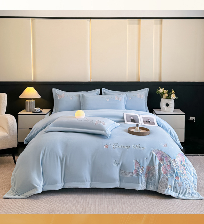 锦铭源家纺 2025新款75D全消光超柔樱花绒绣花四件套牛奶绒四件套【有买家秀】 蝶恋-蓝