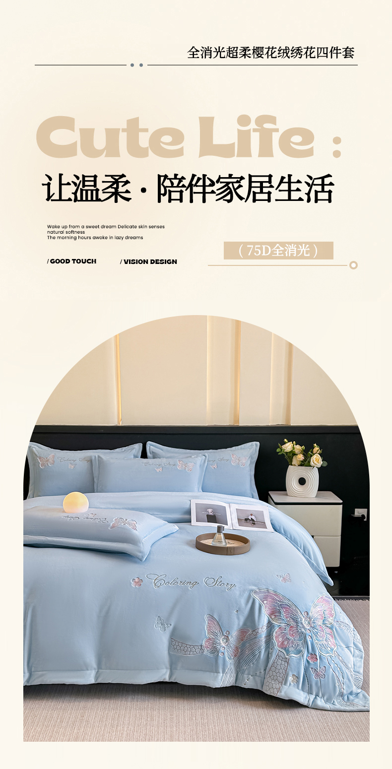 (总)锦铭源家纺 2025新款75D全消光超柔樱花绒绣花四件套牛奶绒四件套【有买家秀】,花颜-浅绿,花颜-奶白,花颜-蓝,花颜-咖,花颜-灰,花颜-粉,蝶恋-浅绿,蝶恋-奶白,蝶恋-蓝,蝶恋-咖,蝶恋-灰,蝶恋-粉