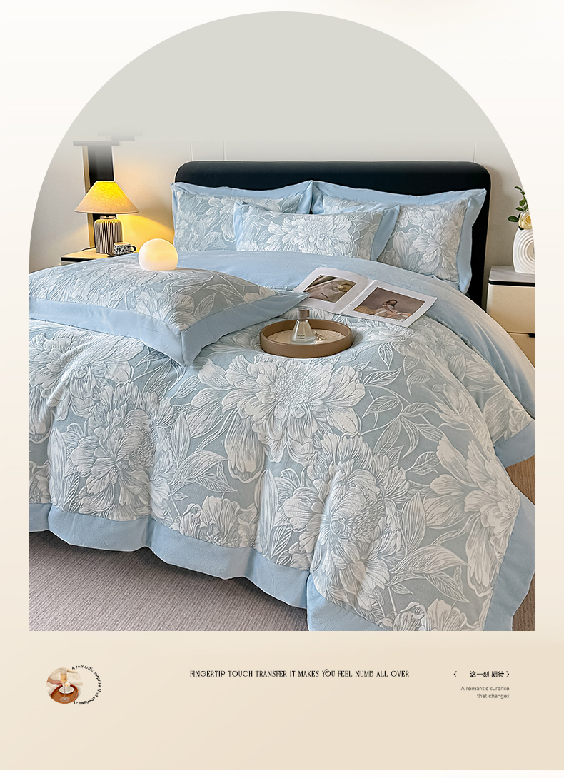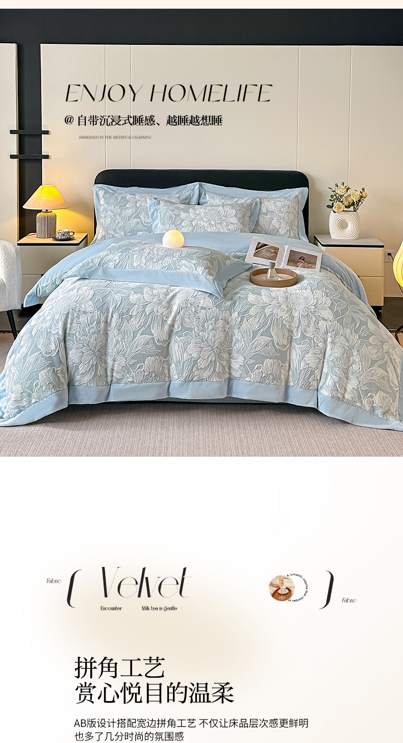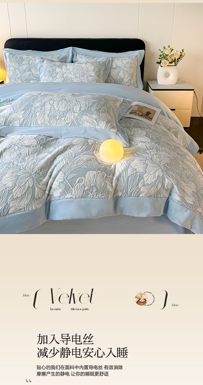 商品名称:锦铭源家纺 2025新款烂花75D全消光超柔樱花绒牛奶绒四件套拼角四件套【有买家秀】 繁花织梦-蓝