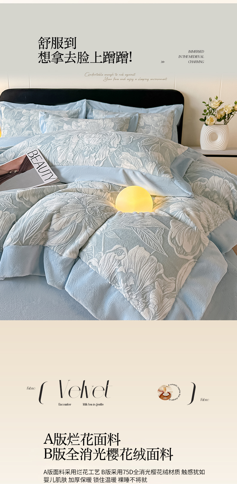 (总)锦铭源家纺 2025新款雪貂绒烂花75D全消光超柔樱花绒双拼角四件套牛奶绒四件套【有买家秀】,轻奢-粉,轻奢-奶白,轻奢-浅绿,轻奢-雅灰