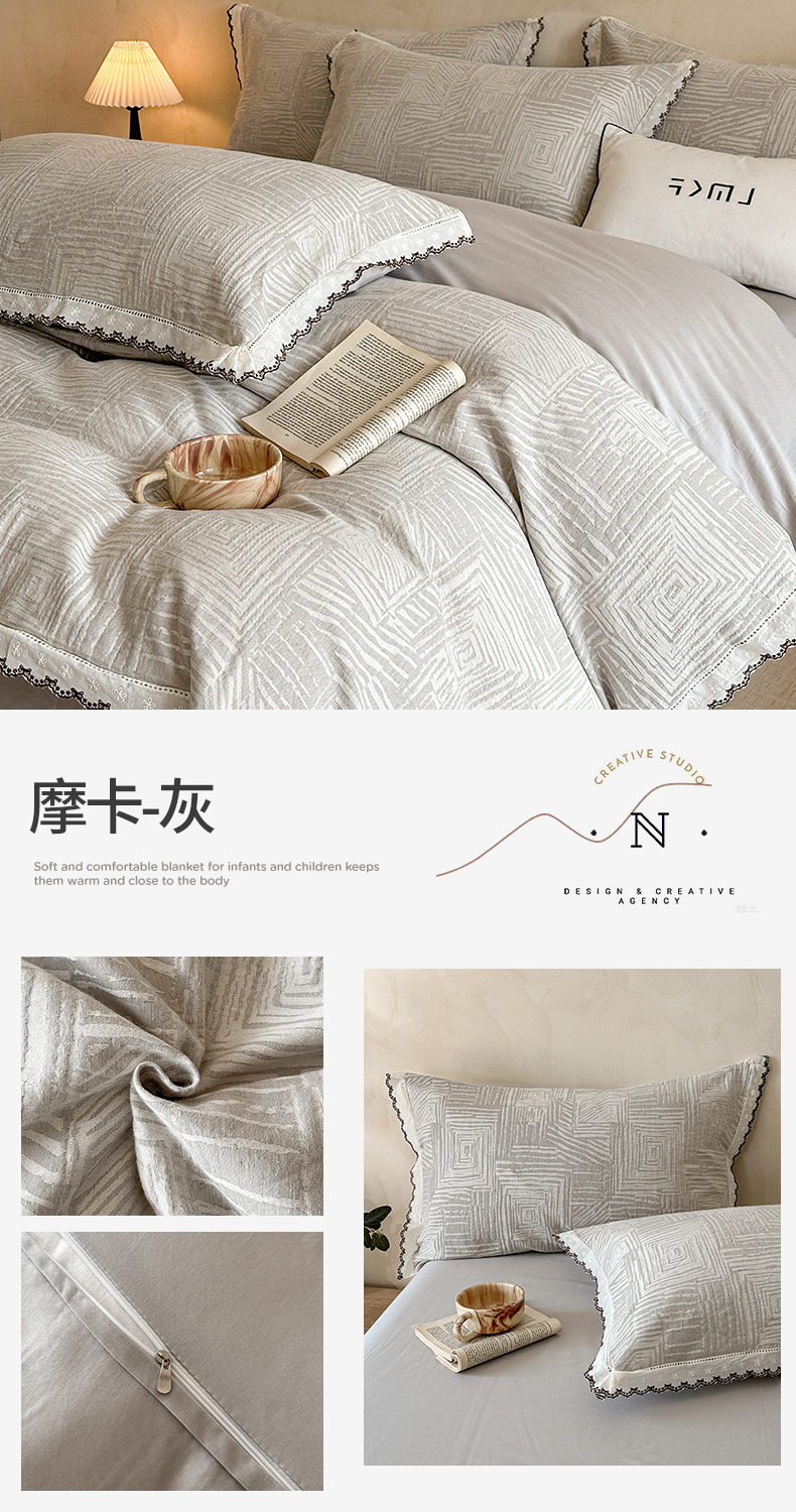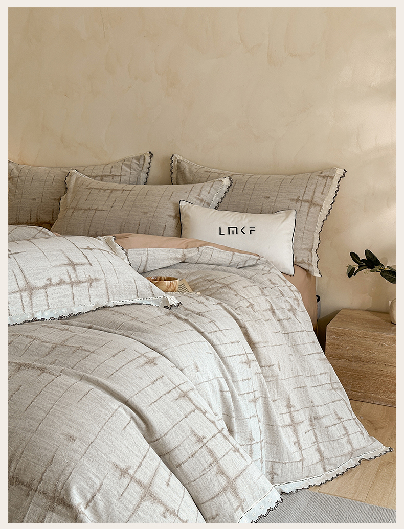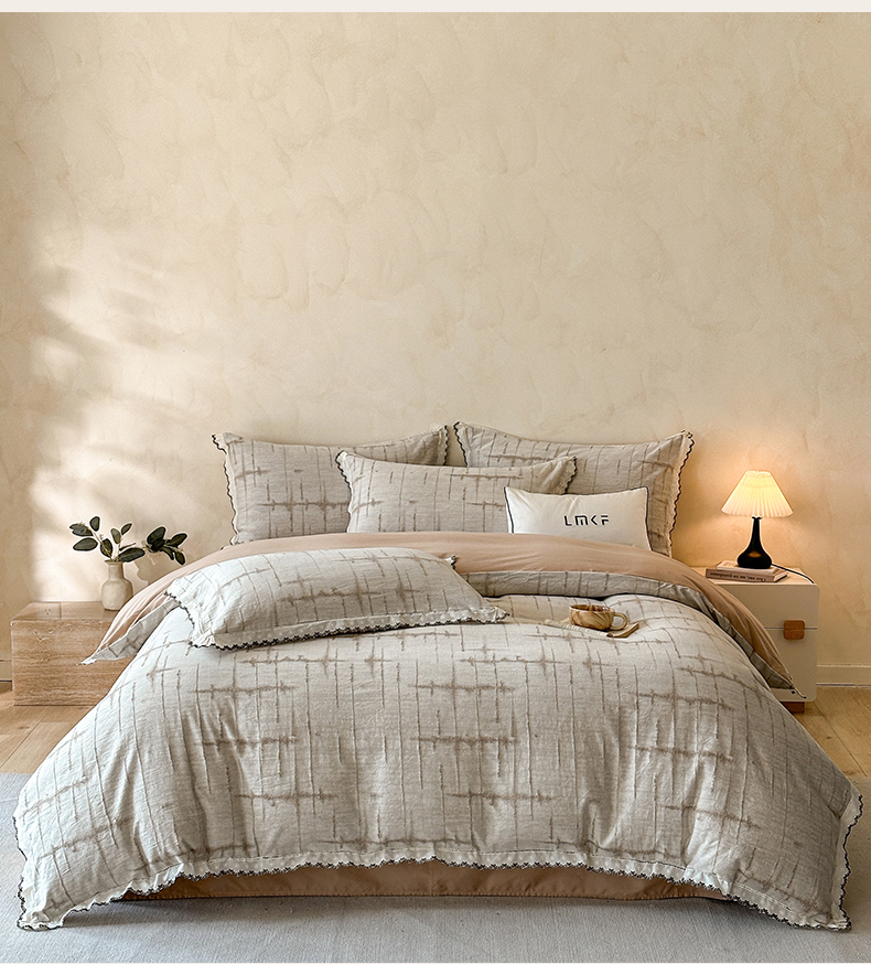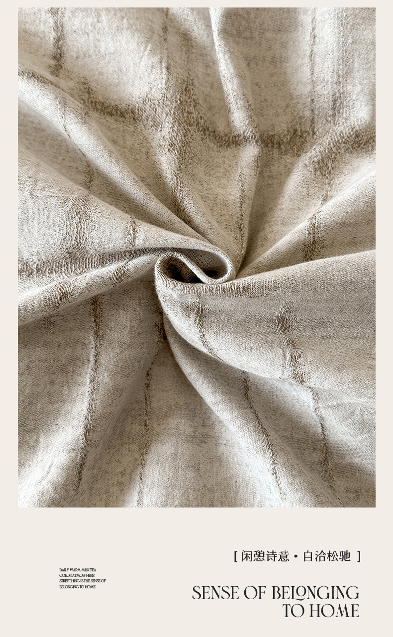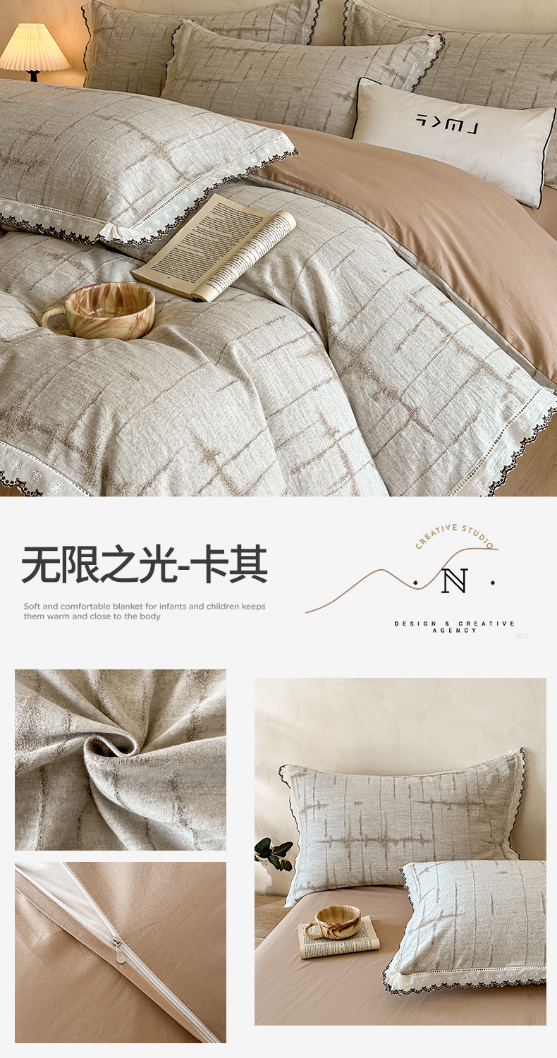 商品名称:蓝米卡夫 2025秋冬-棉麻色织全棉提花60支磨毛花边款(礼盒包装)提供买家秀 无限之光-卡其