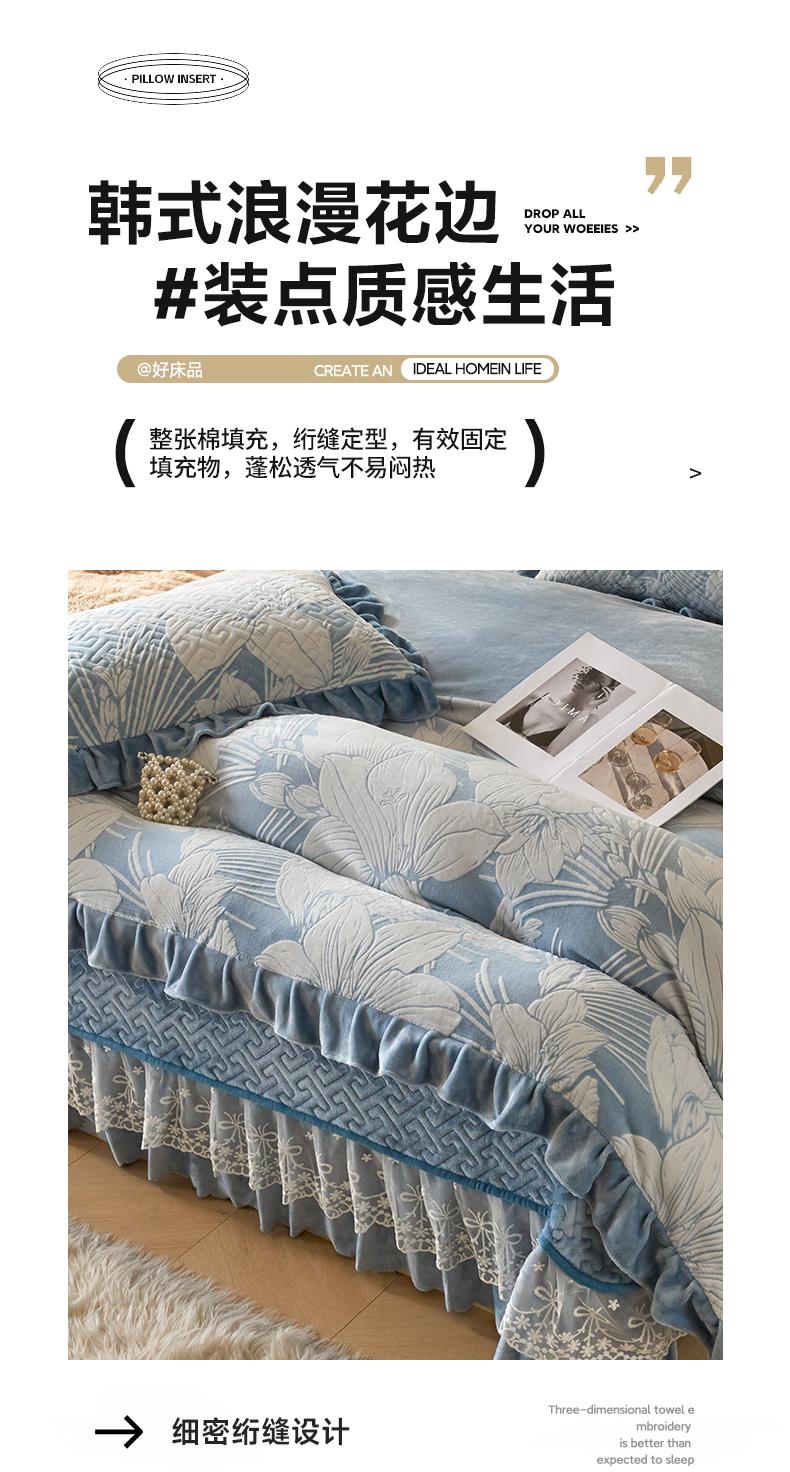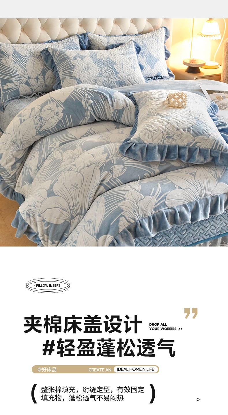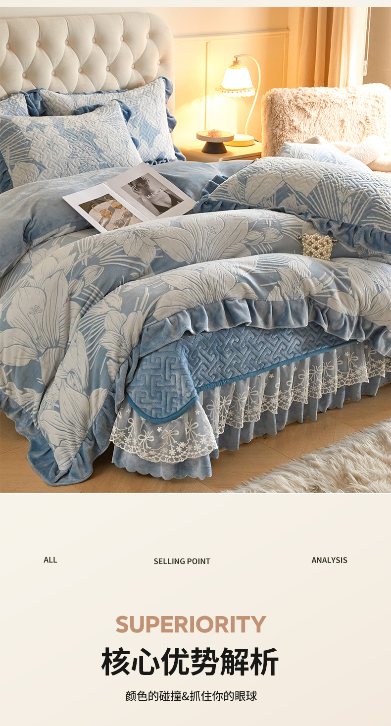 商品名称:畅畅家纺 2025新款11斤高克重新款韩版烂花牛奶绒冬季加厚床盖四件套系列 幽兰-海蓝