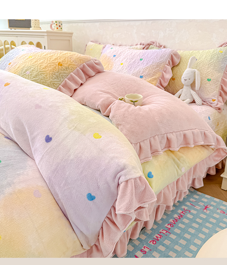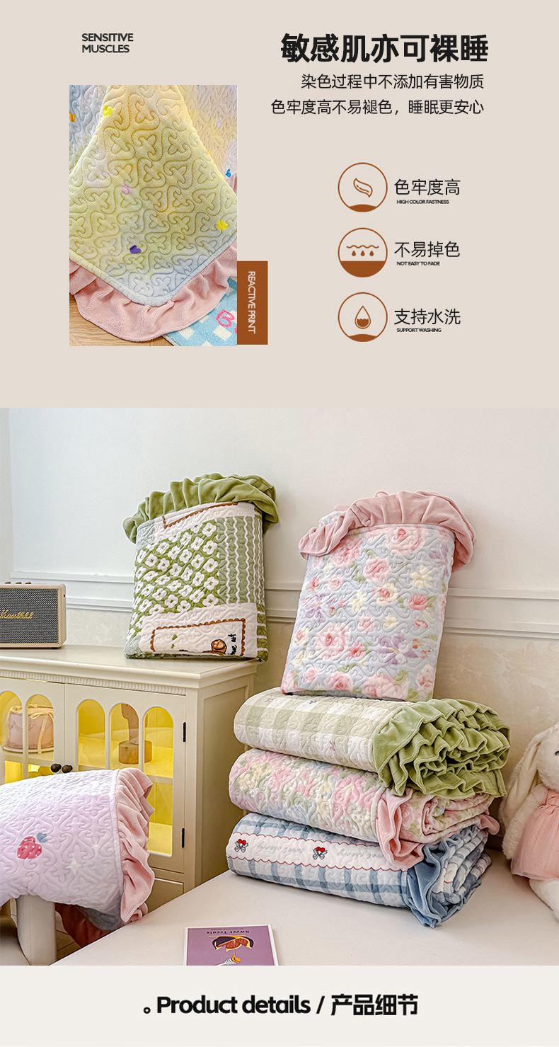 • 91家纺网 家纺一手货源 找家纺 归属 2025新款牛奶绒花边床盖三件套系列 苹果绿