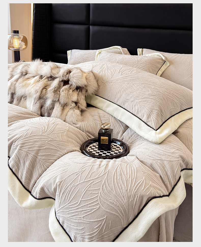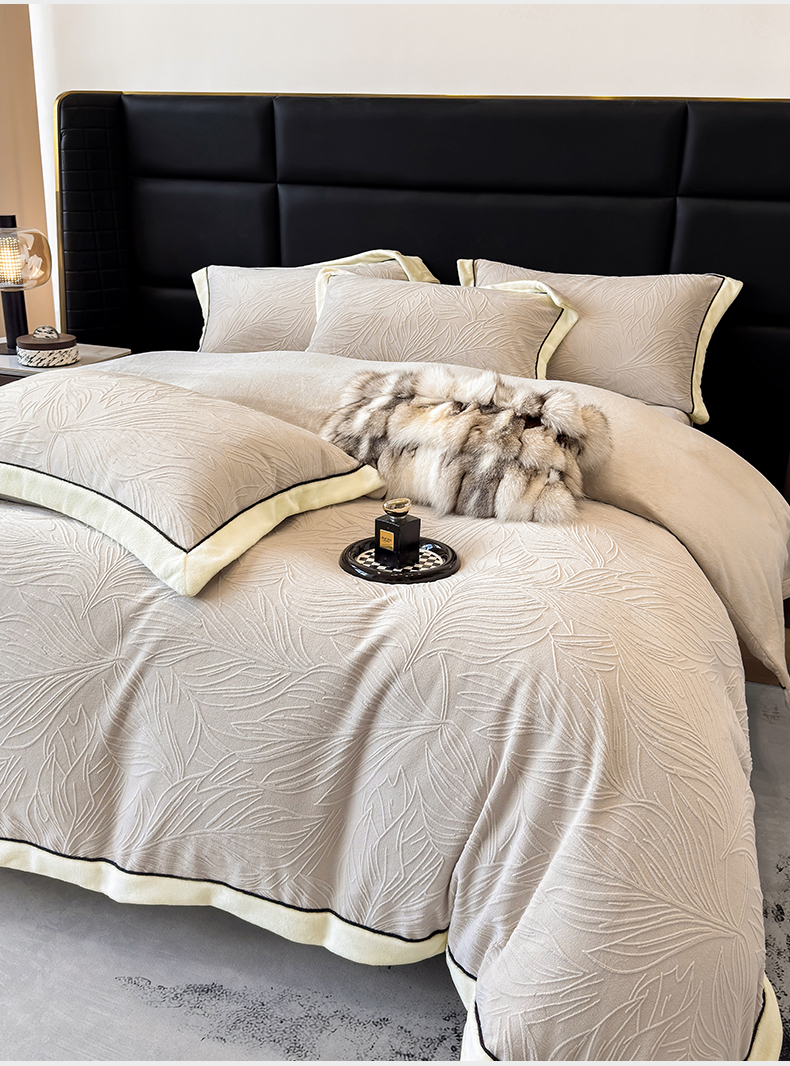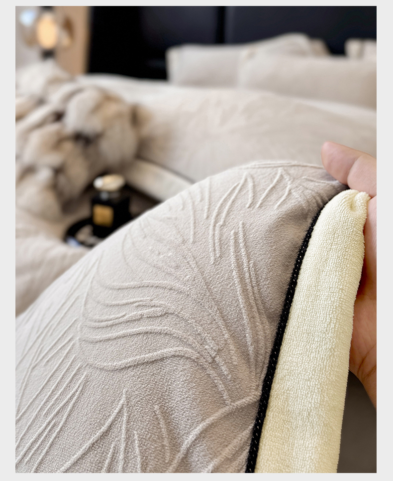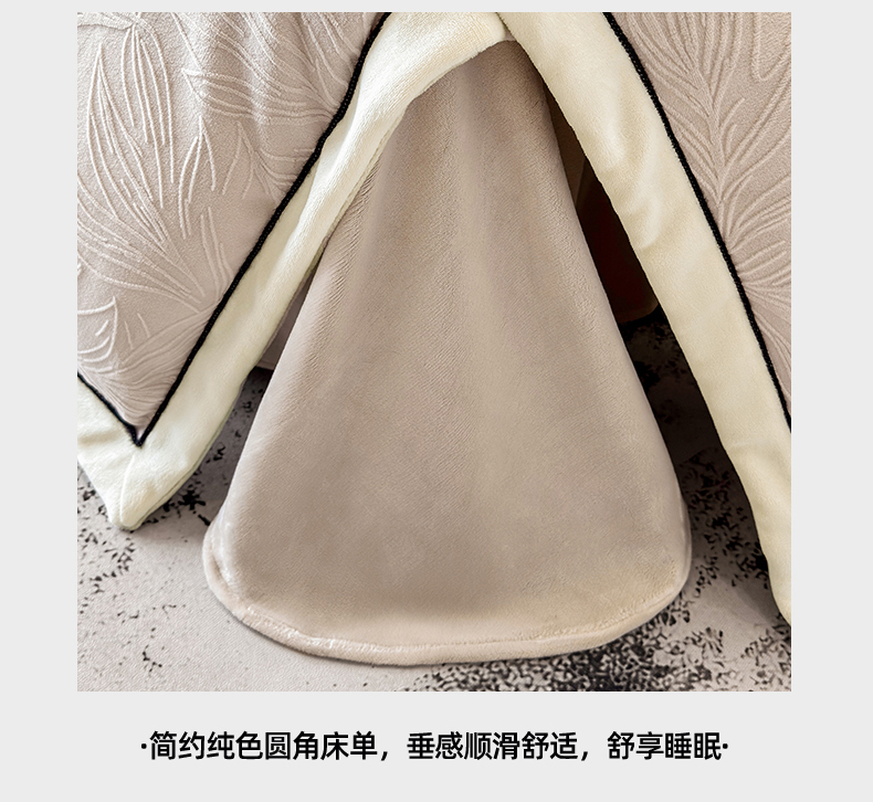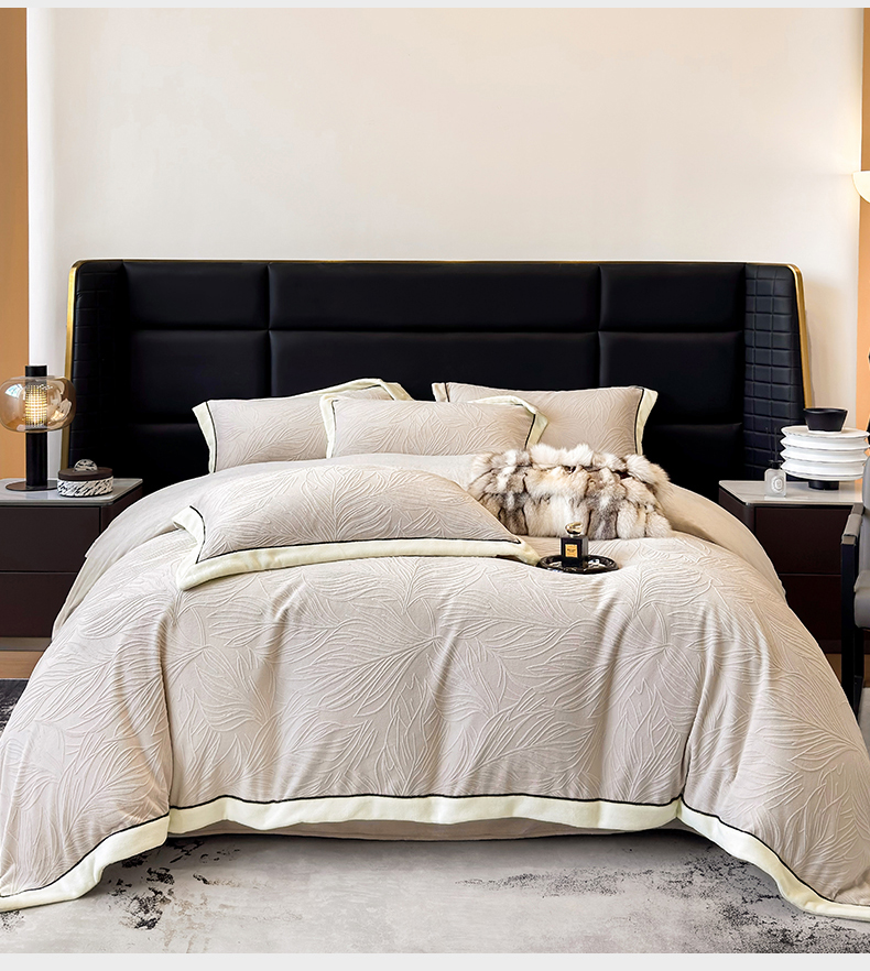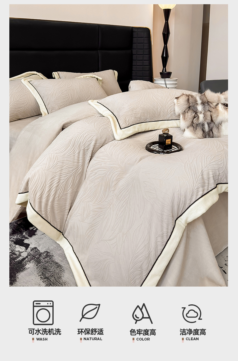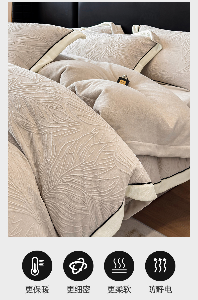 商品名称:金喜 2025秋冬新款230克高克重牛奶绒四件套雕花绒拼角宽边嵌绳系列四件套 叶影-米棕