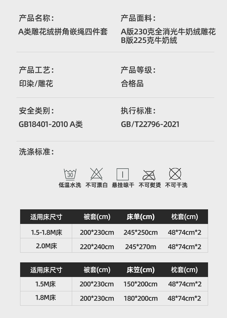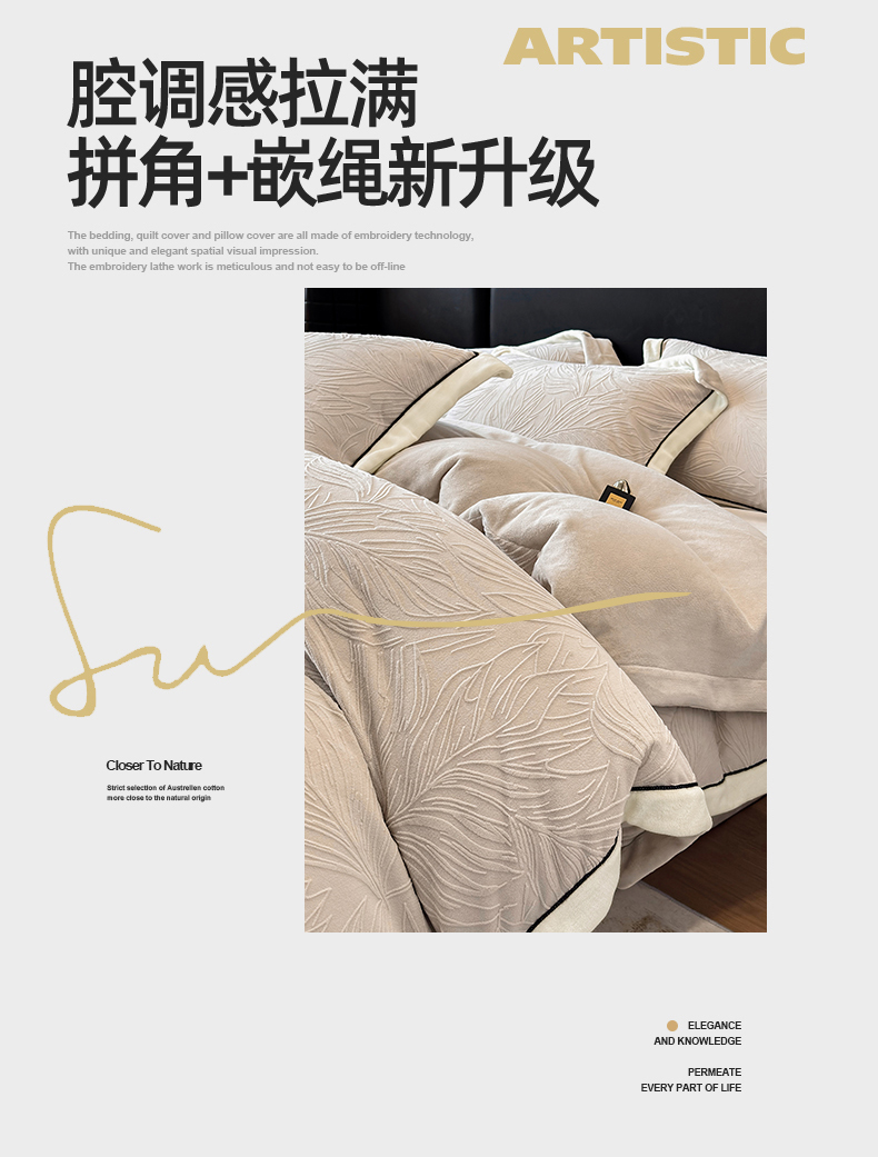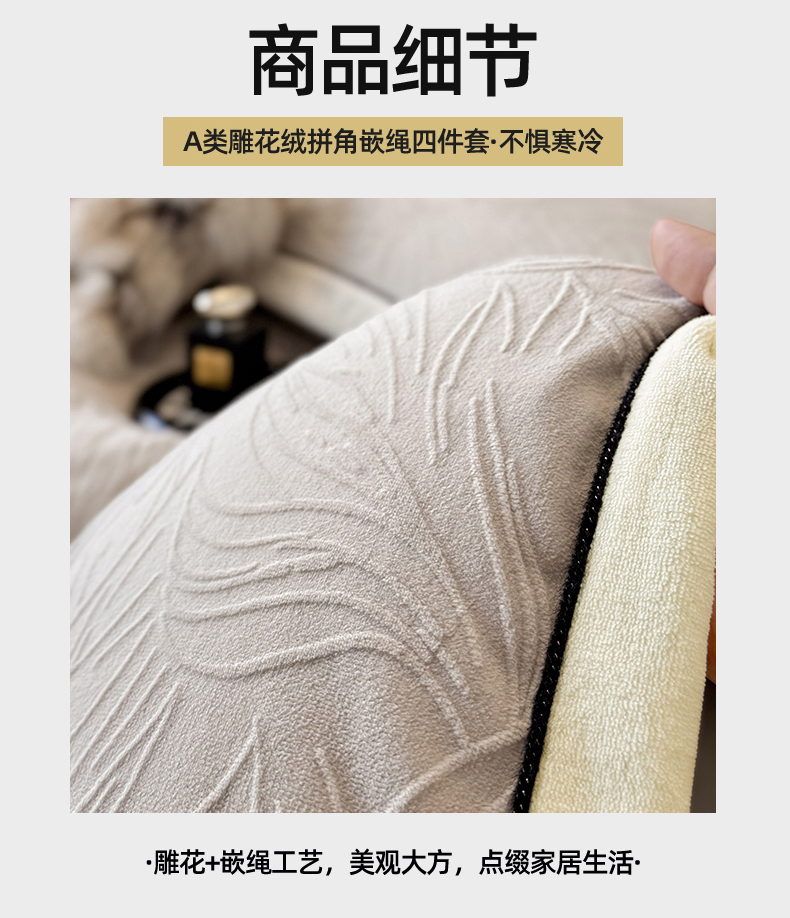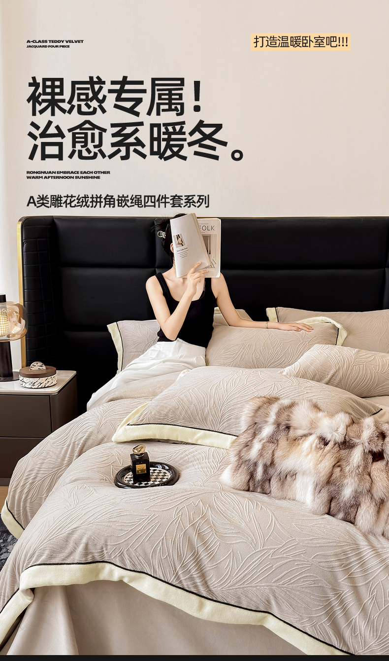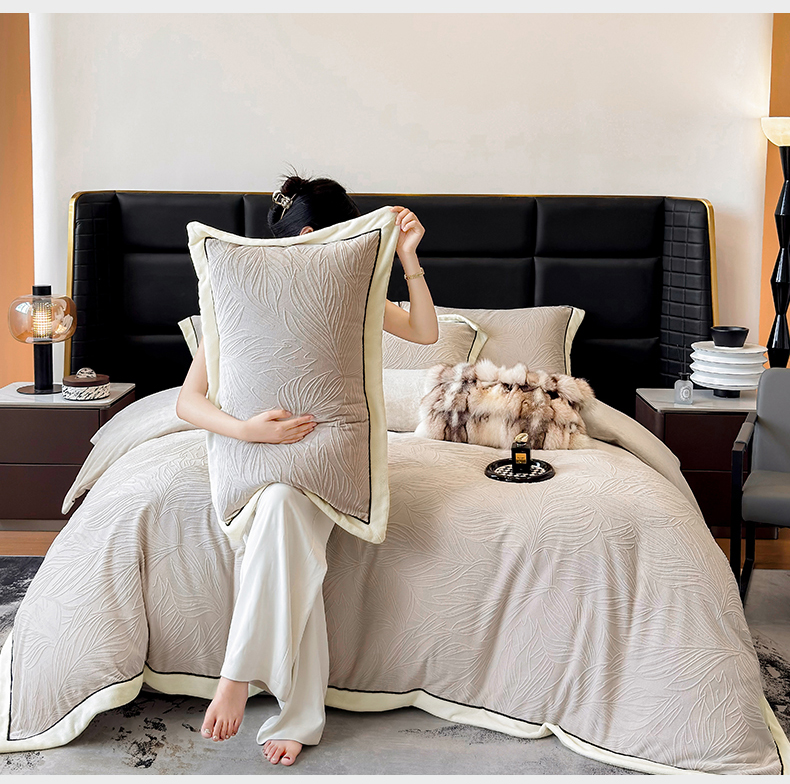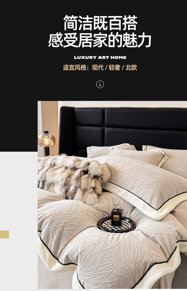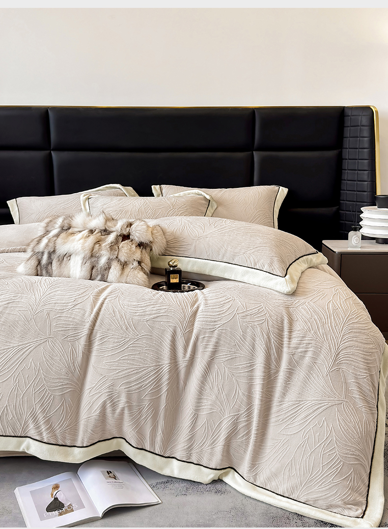 商品名称:金喜 2025秋冬新款230克高克重牛奶绒四件套雕花绒拼角宽边嵌绳系列四件套 叶影-米棕