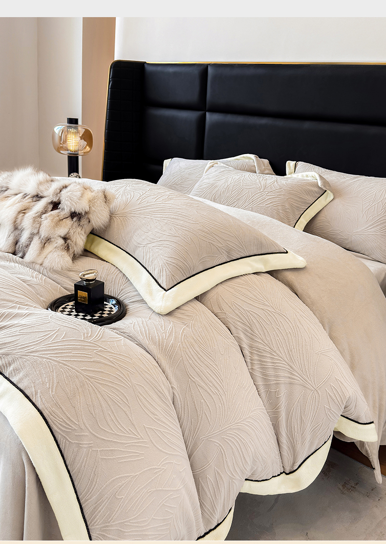 金喜 2025秋冬新款230克高克重牛奶绒四件套雕花绒拼角宽边嵌绳系列四件套 叶影-米棕