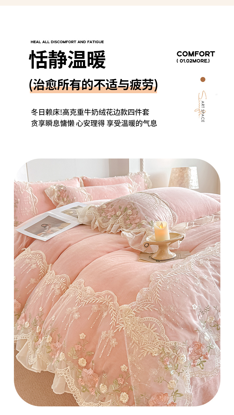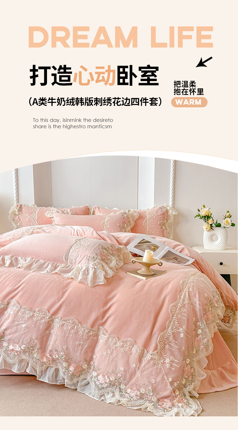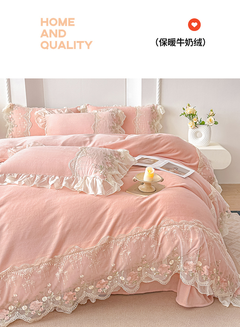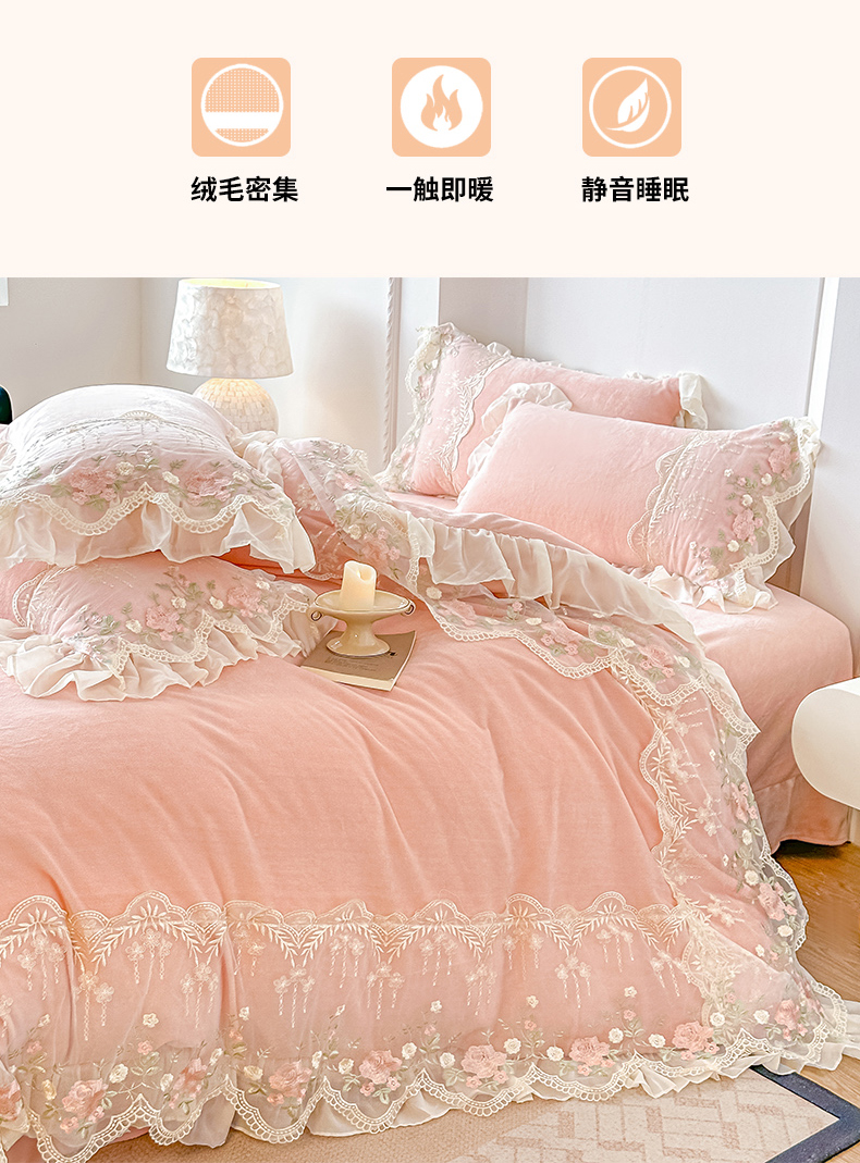 当前位置: 91家纺网 > 商品网购 > 床品套件 > 四件套 > 牛奶绒四件套 > 凯美家居 2025新款A类牛奶绒蕾丝刺绣四件套-锦上添花 锦上添花-粉玉