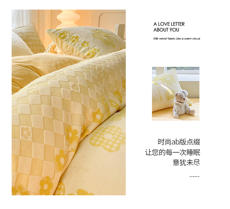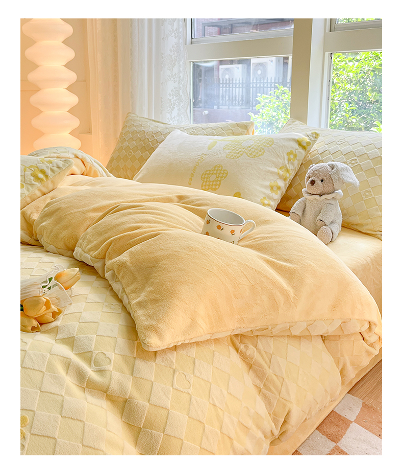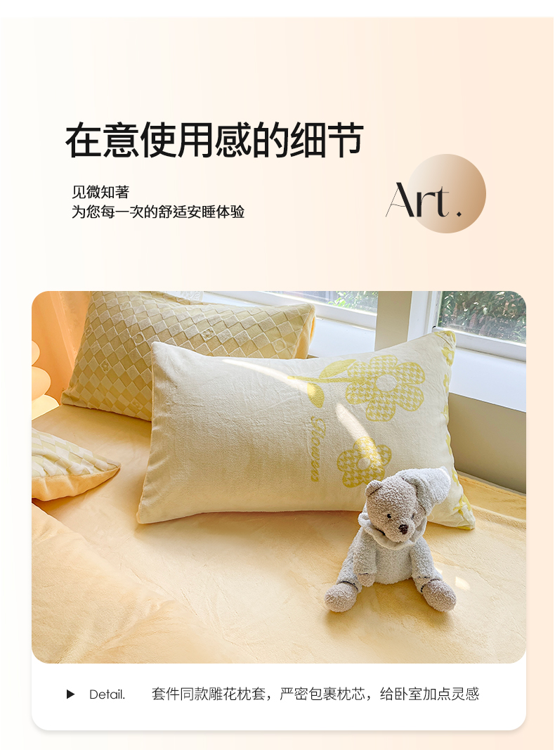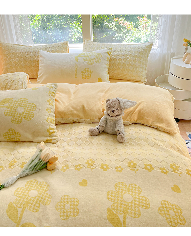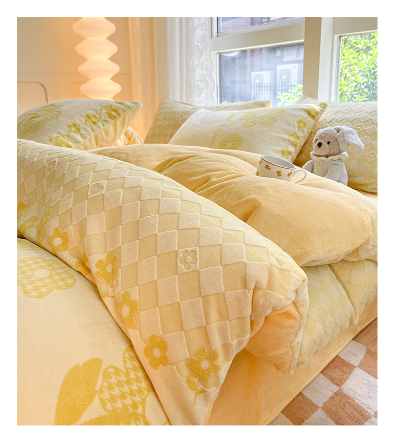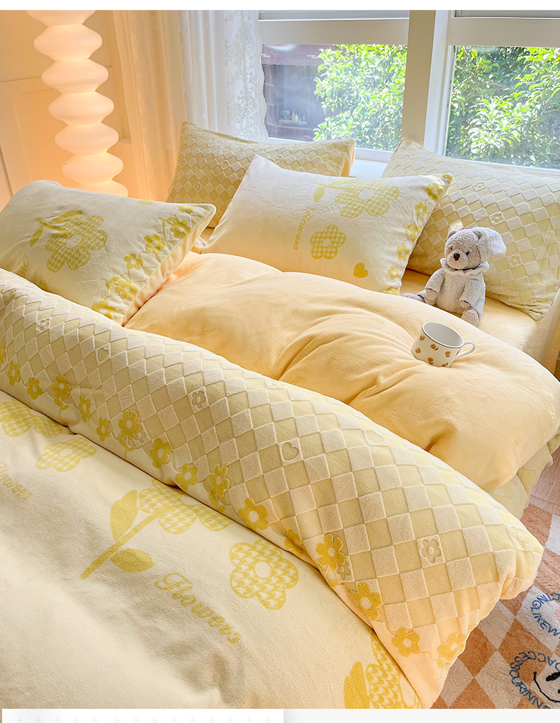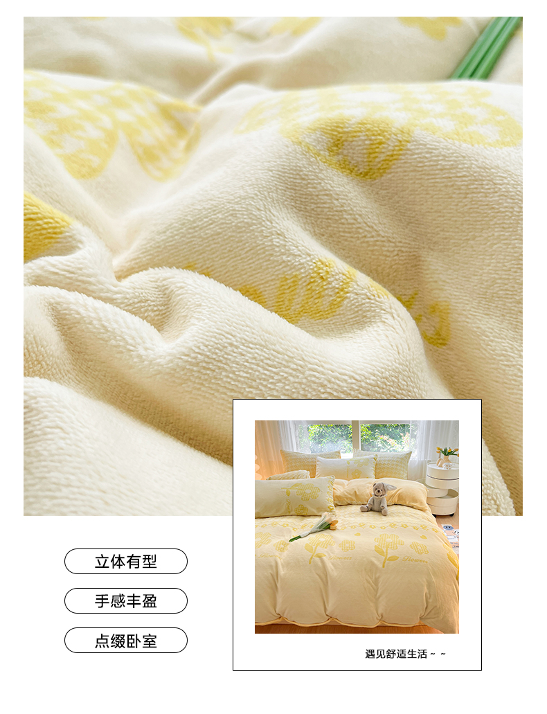 商品名称:雅居纺家纺 2025新款立体雕花牛奶绒四件套-幸运花系列 幸运花-米黄