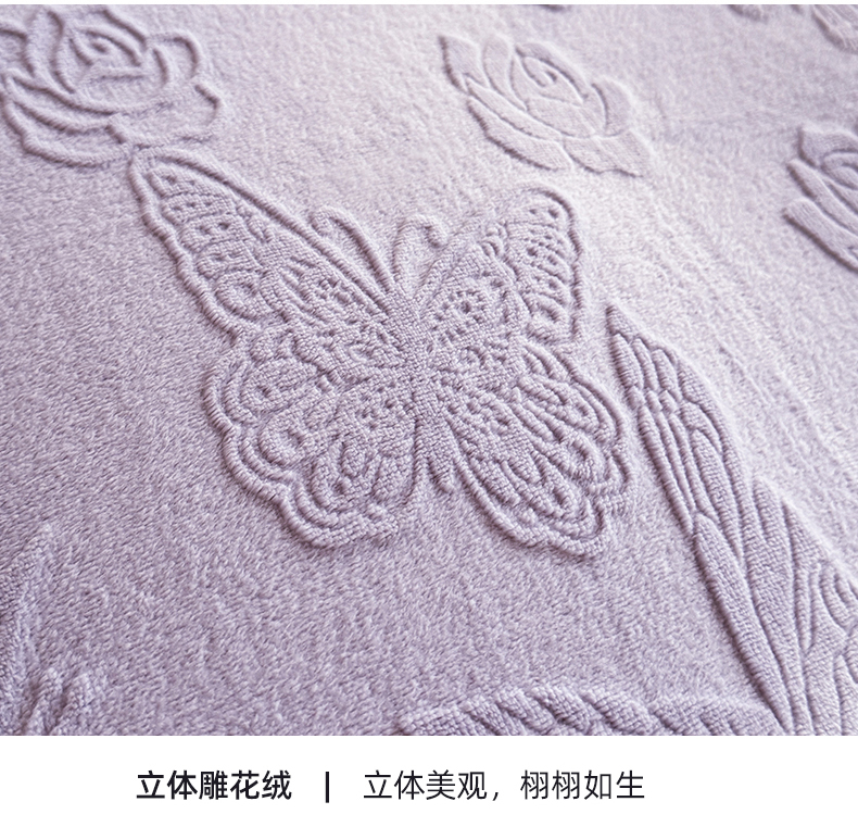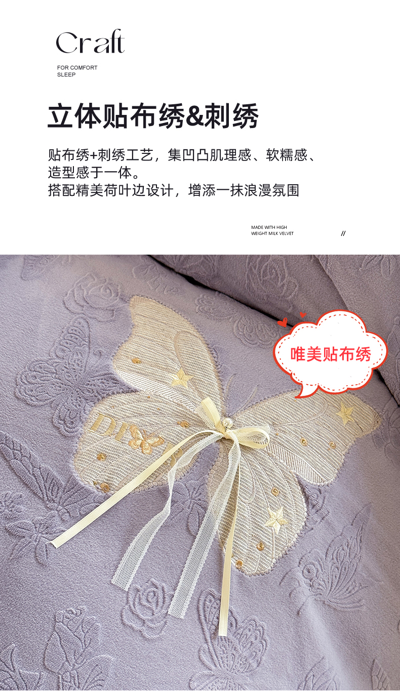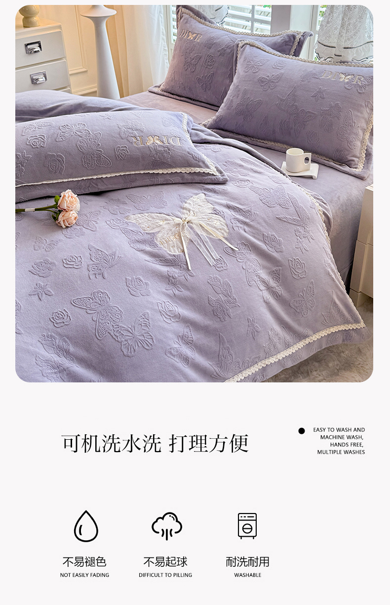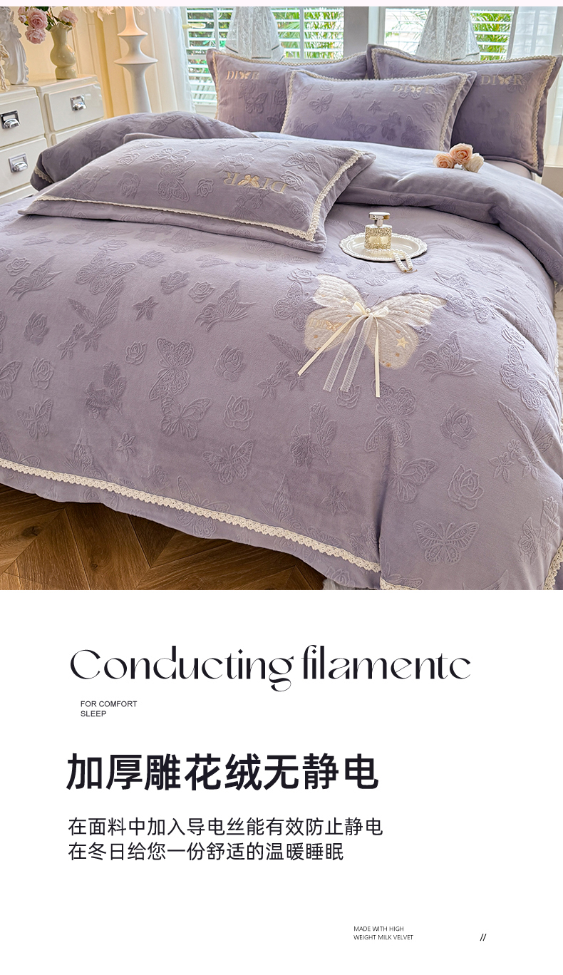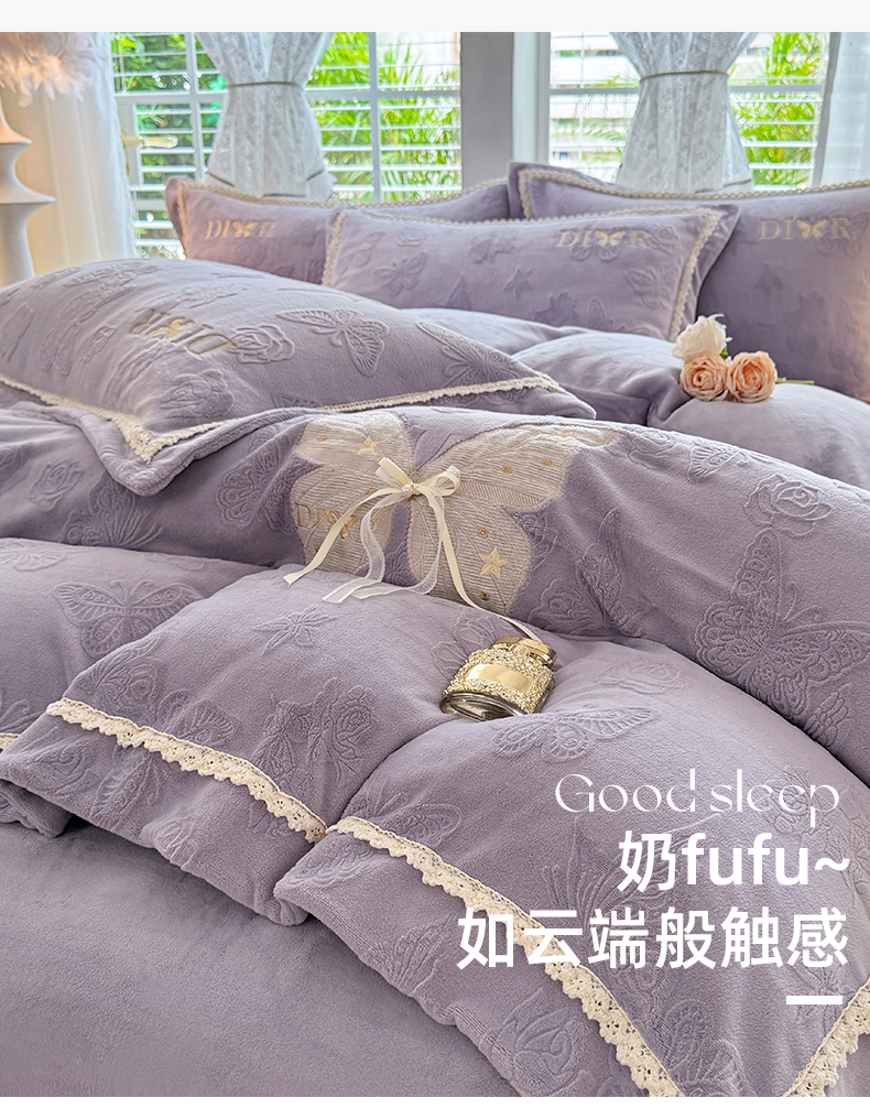 商品名称:艾唯希家纺 2025新款韩版雕花绒工艺四件套全消光牛奶绒-语蝶系列 语蝶-紫