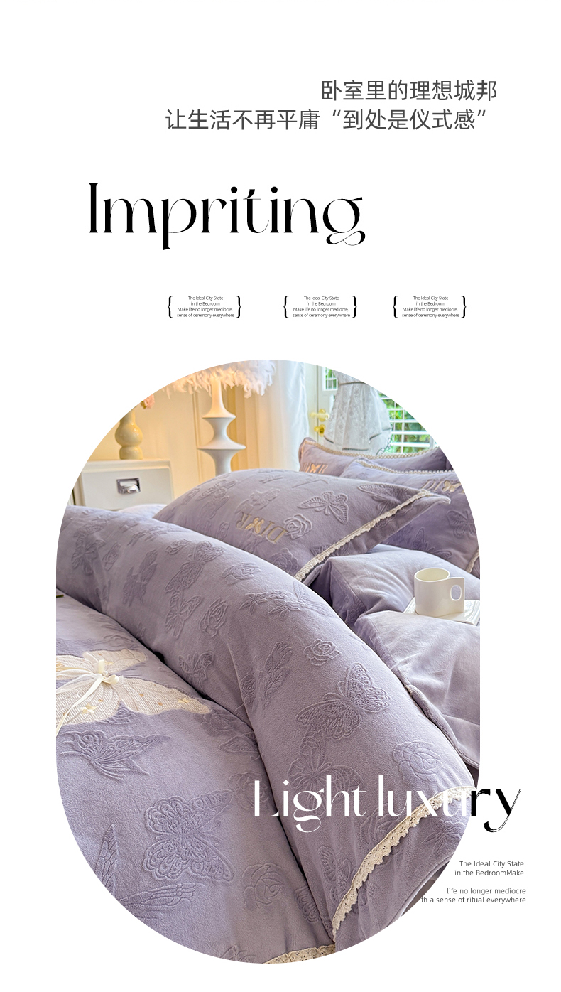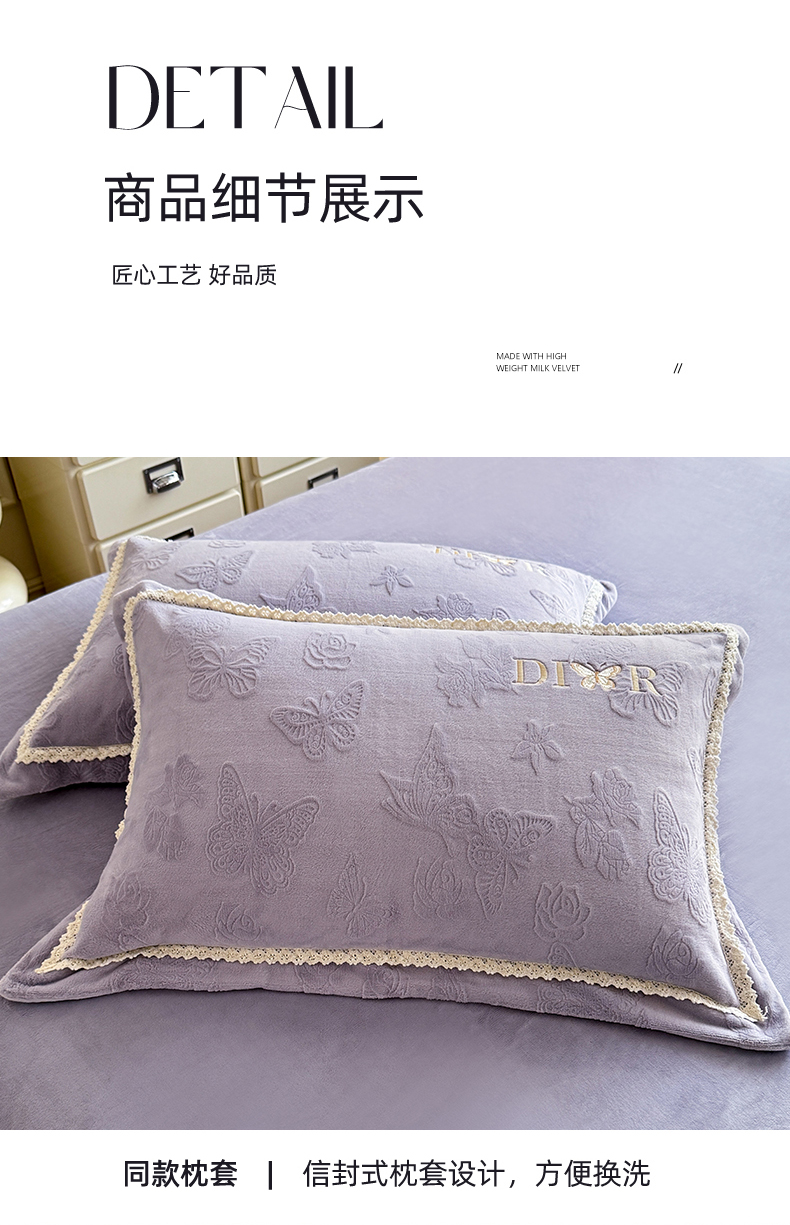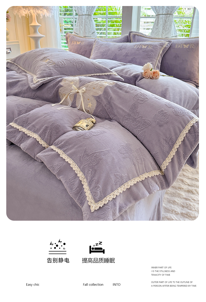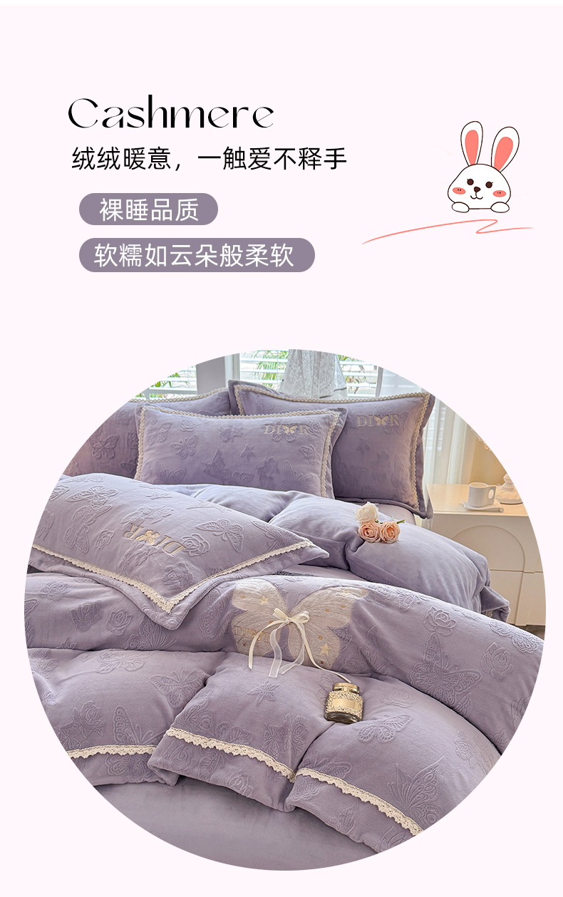 商品名称:艾唯希家纺 2025新款韩版雕花绒工艺四件套全消光牛奶绒-语蝶系列 语蝶-紫