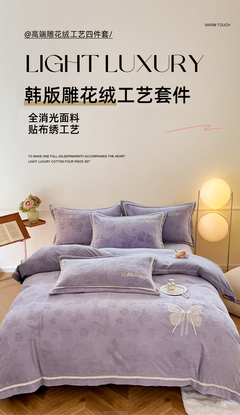 艾唯希家纺 2025新款韩版雕花绒工艺四件套全消光牛奶绒-语蝶系列 语蝶-紫