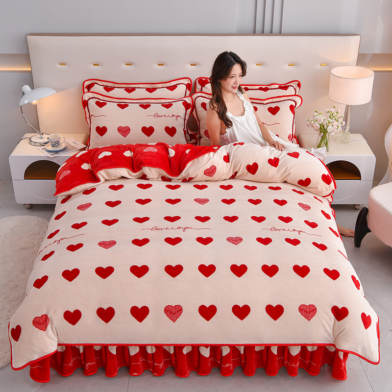 赛丽雅 2025新款牛奶绒床裙四件套8-9斤法莱绒直播爆款日产2万套 红色爱心