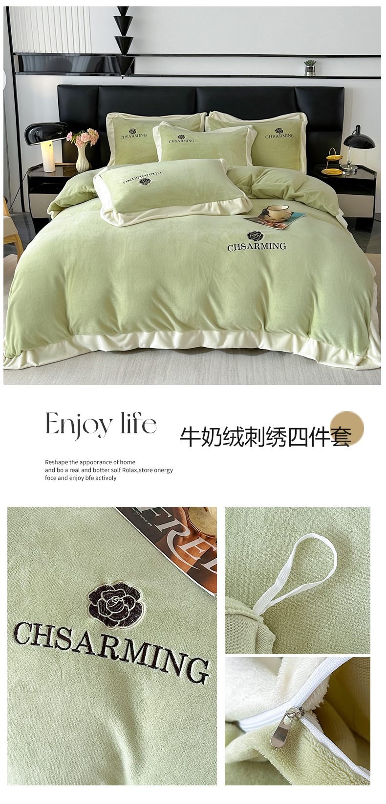 商品名称:畅畅家纺 2025新款冬季加厚牛奶绒刺绣加绒保暖四件套-山茶花系列 山茶花-果绿