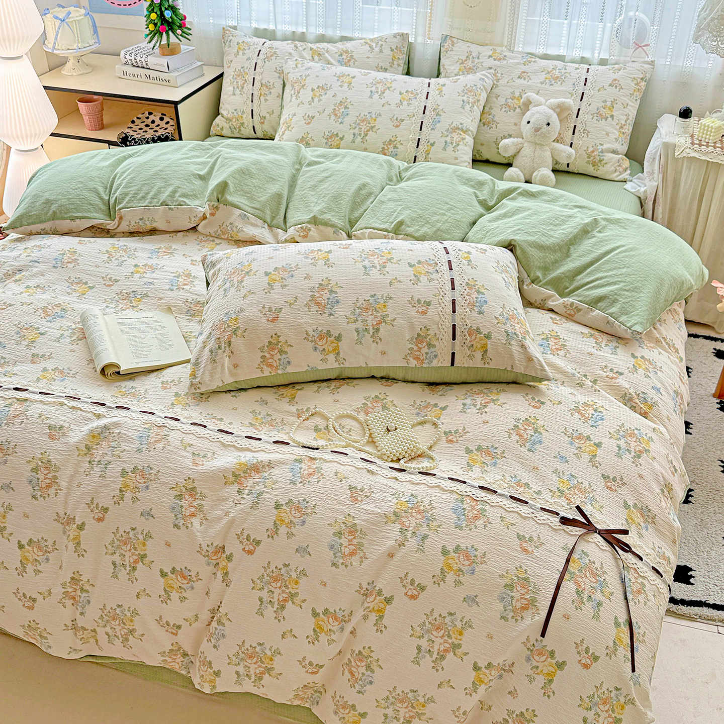 商品名称:梵克保罗 2025新款古法水洗棉全棉花边蝴蝶结四件套 组合图仅供展示