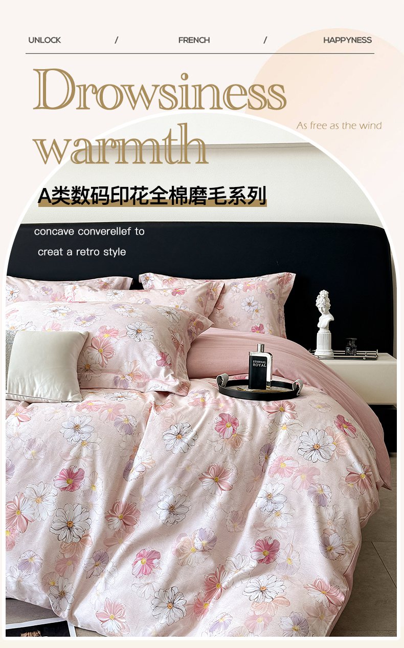 当前位置: 91家纺网 > 商品网购 > 床品套件 > 四件套 > 普通磨毛四件套 > 梵克保罗 2025秋冬新款数码印花全棉磨毛单被套三件套四件套系列 双花飘香