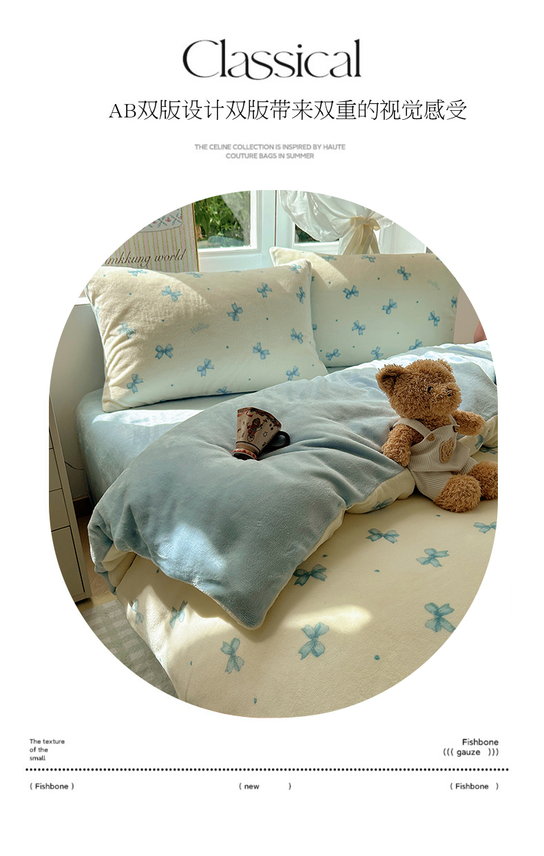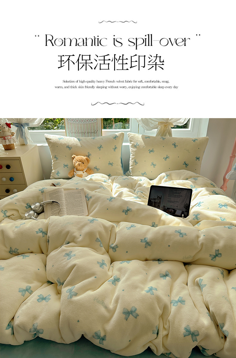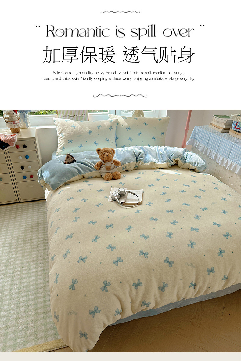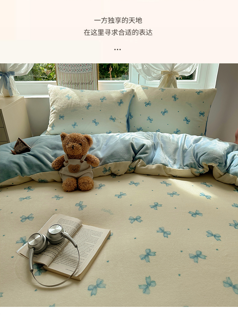 当前位置: 91家纺网 > 商品网购 > 床品套件 > 四件套 > 牛奶绒四件套 > 优选良品 2025新款小清新加厚高克重牛奶绒四件套直播热款电商热款蓝色蝴蝶结