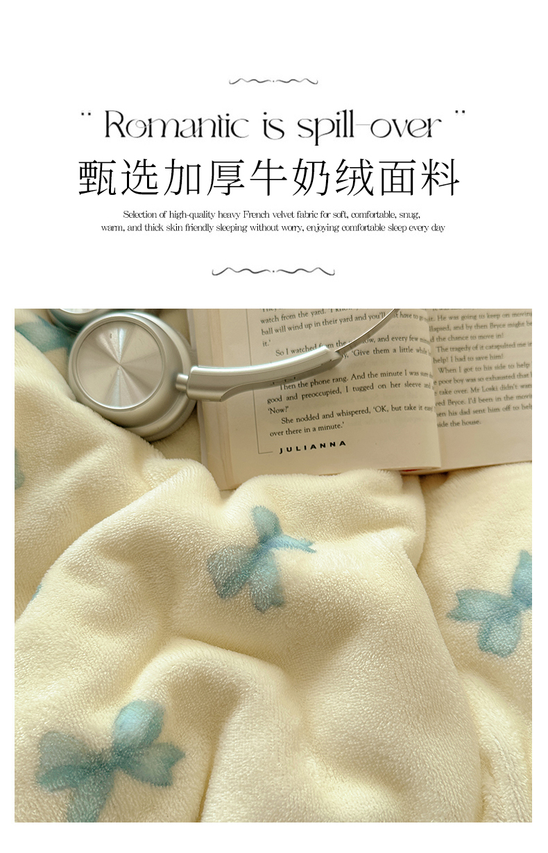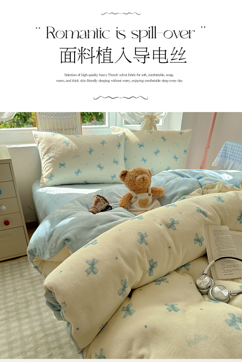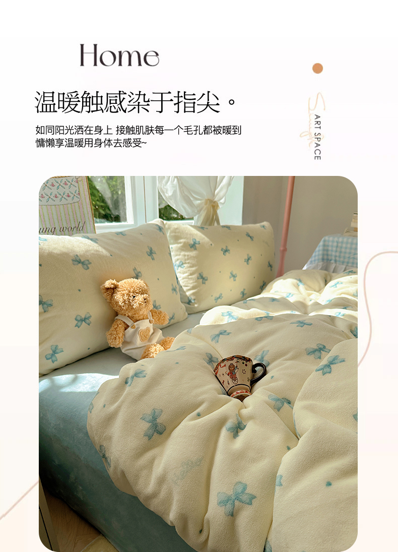当前位置: 91家纺网 > 商品网购 > 床品套件 > 四件套 > 牛奶绒四件套 > 优选良品 2025新款小清新加厚高克重牛奶绒四件套直播热款电商热款蓝色蝴蝶结