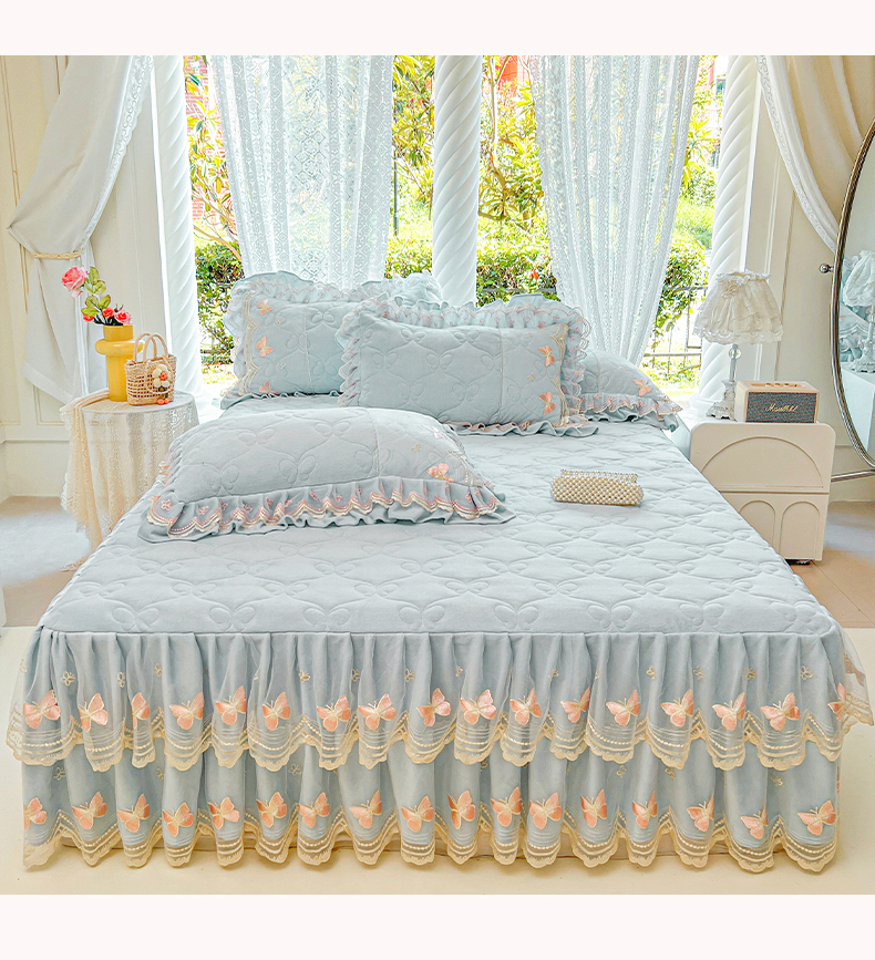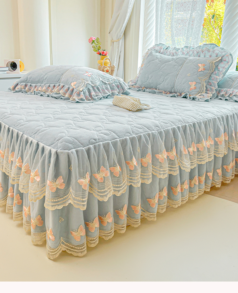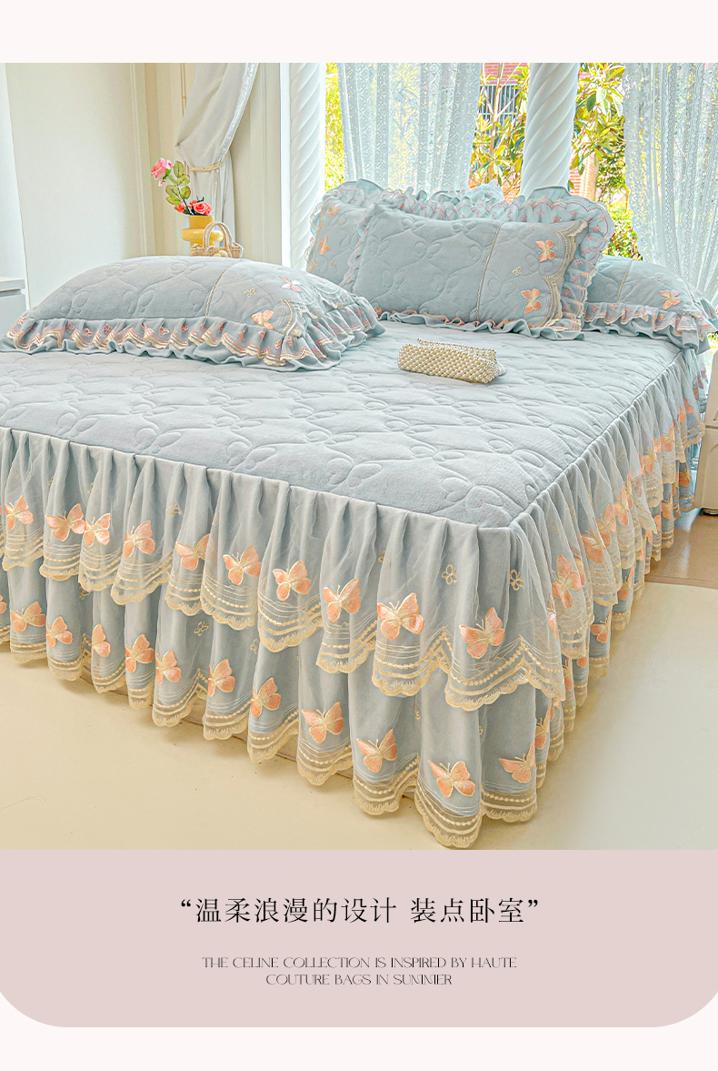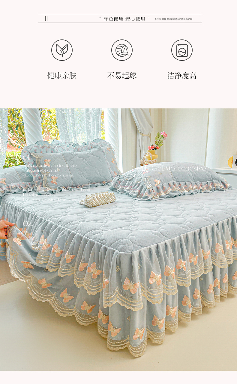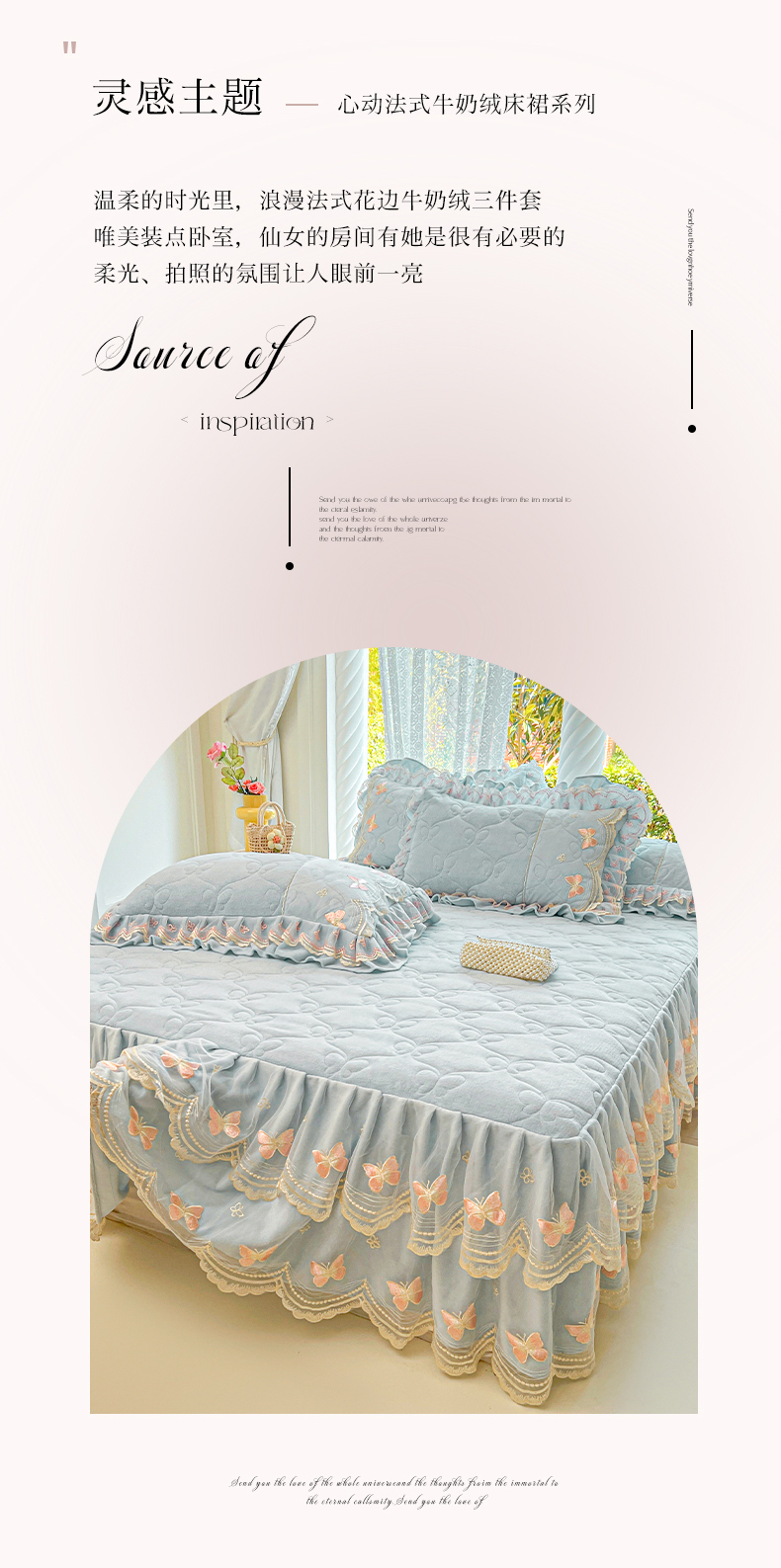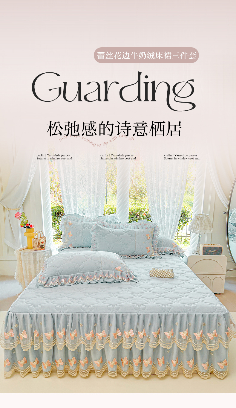 当前位置: 91家纺网 > 商品网购 > 床品套件 > 三件套 > 虹星家纺 2025新款花边牛奶绒床裙三件套系列 蝶恋-天空蓝