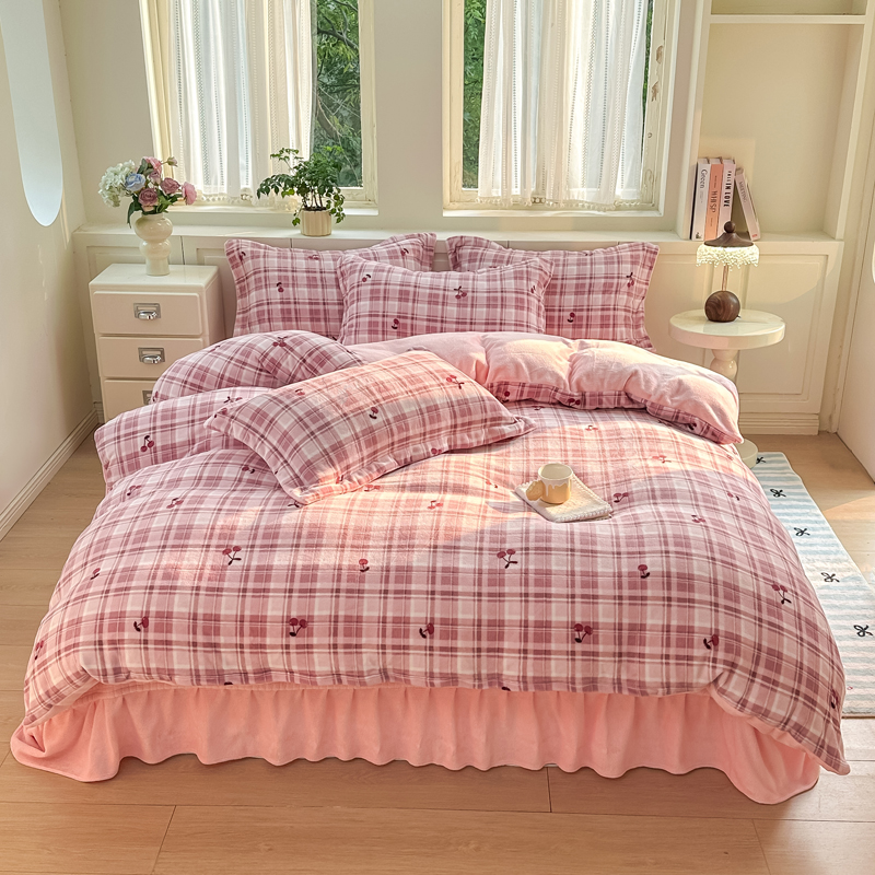 (总)欧尚 2025新款牛奶绒花边床盖四件套,粉点点,花小玉,咖色小心心,蓝点点,慕然,仙女粉,仙女紫