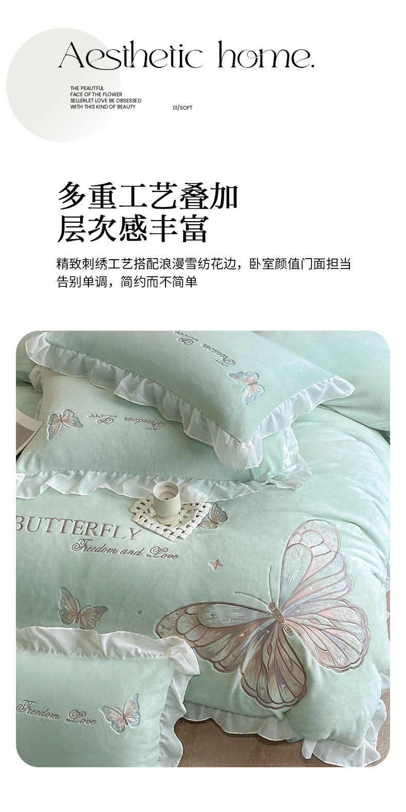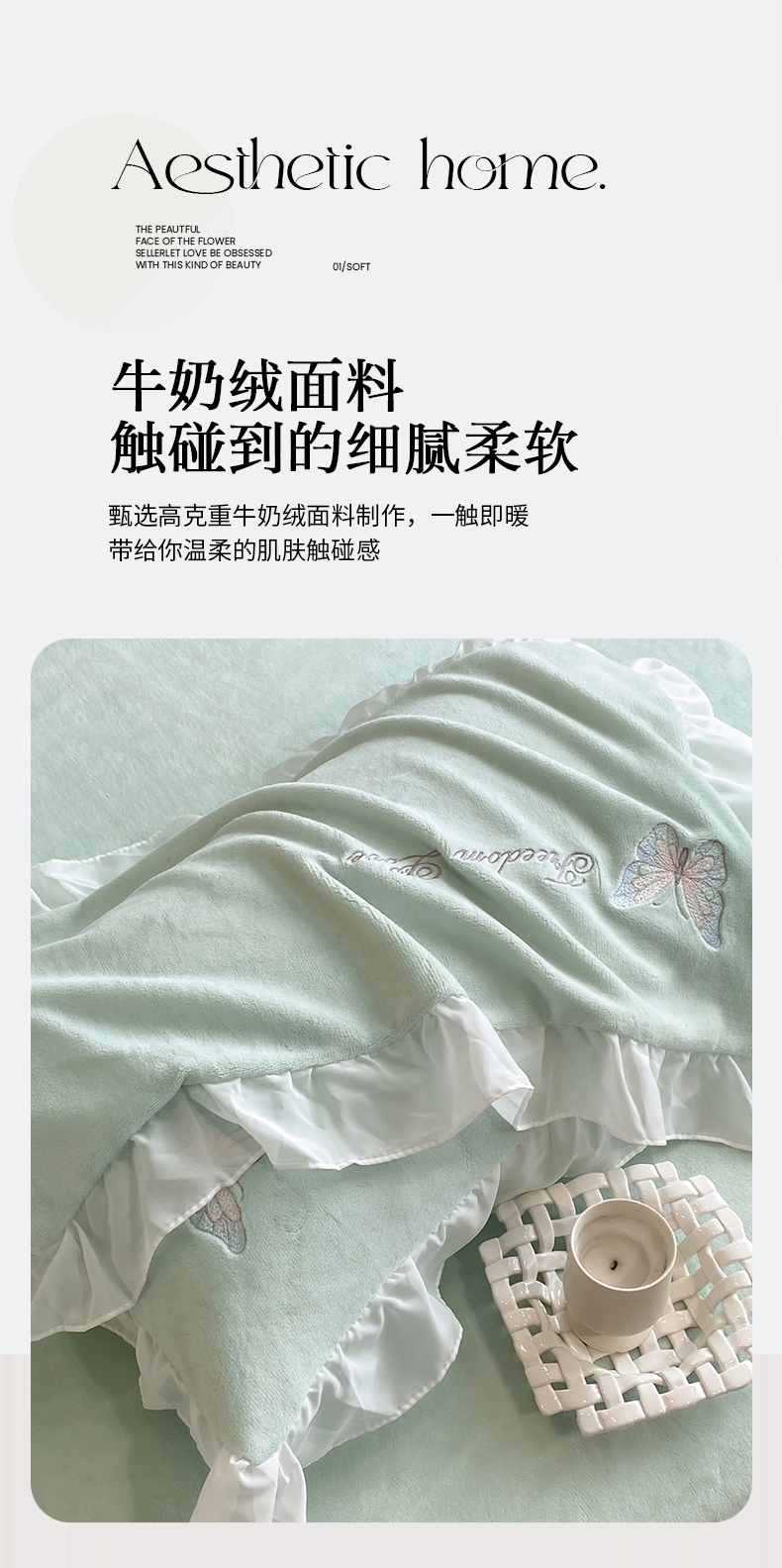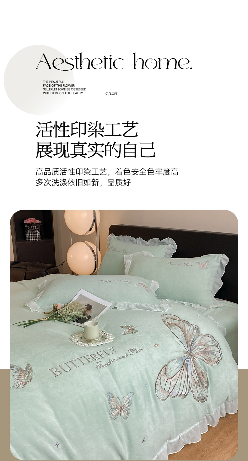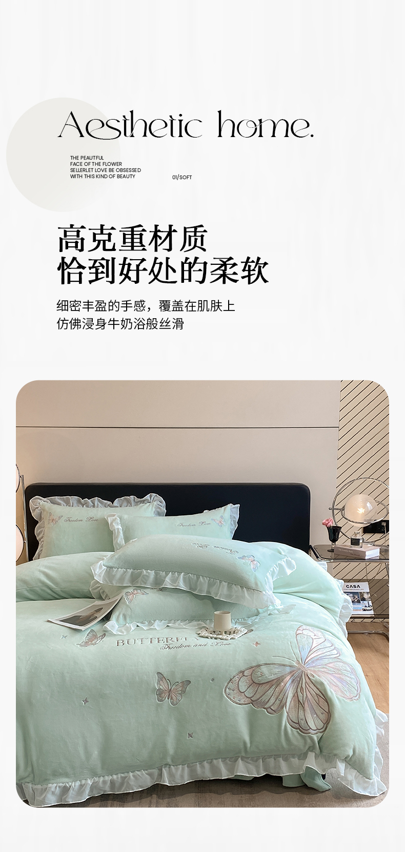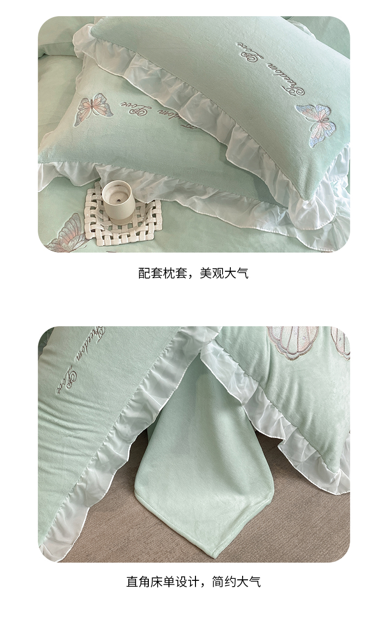 商品名称:木子家纺 2025新款牛奶绒纯色刺绣花边四件套 美蝶绿