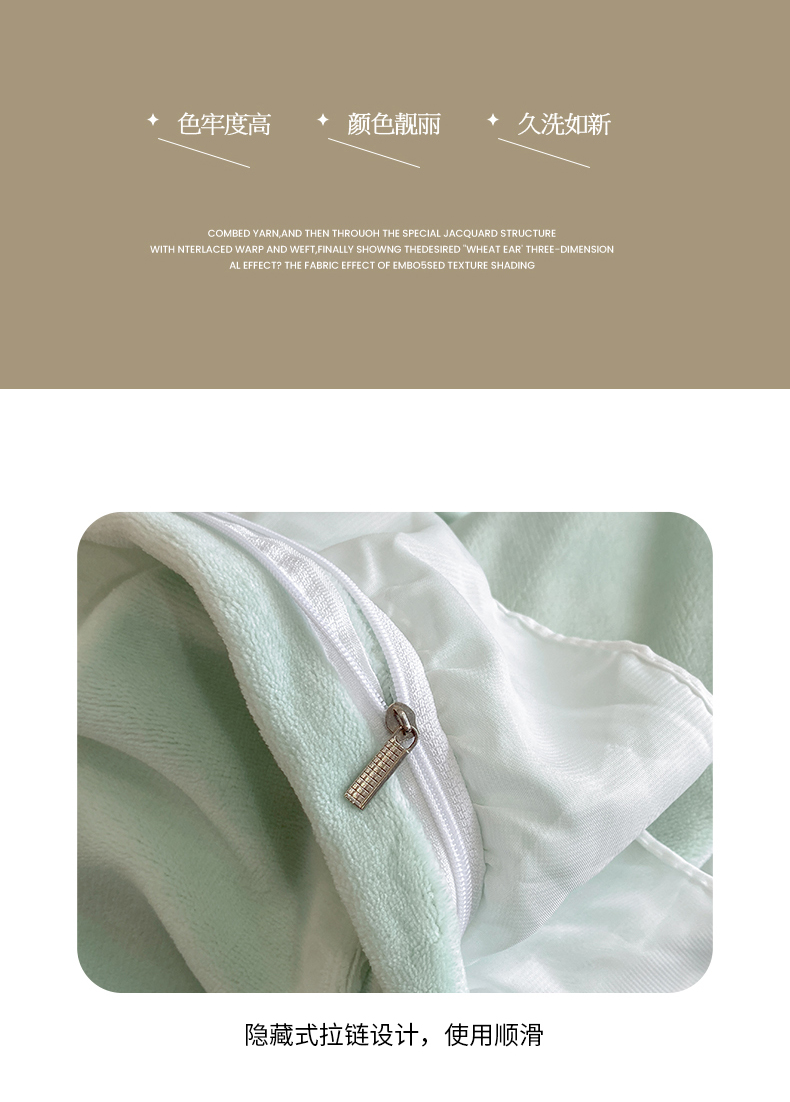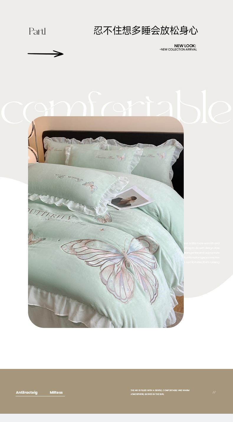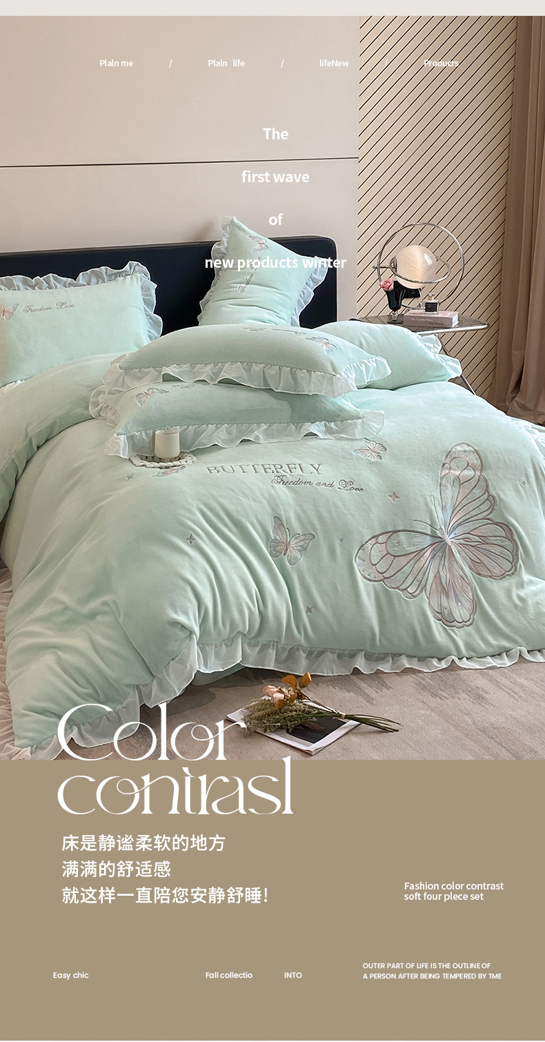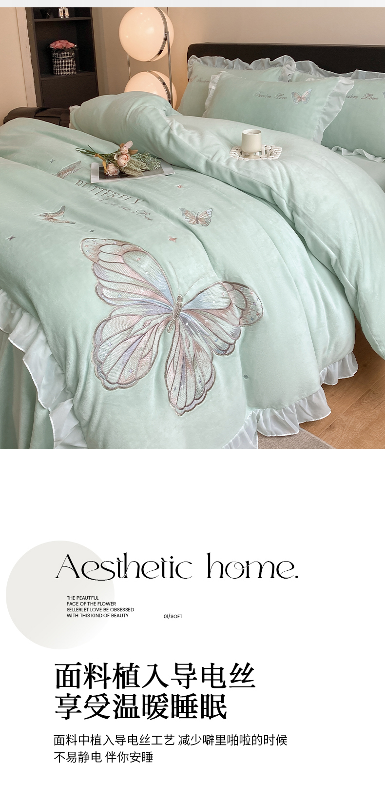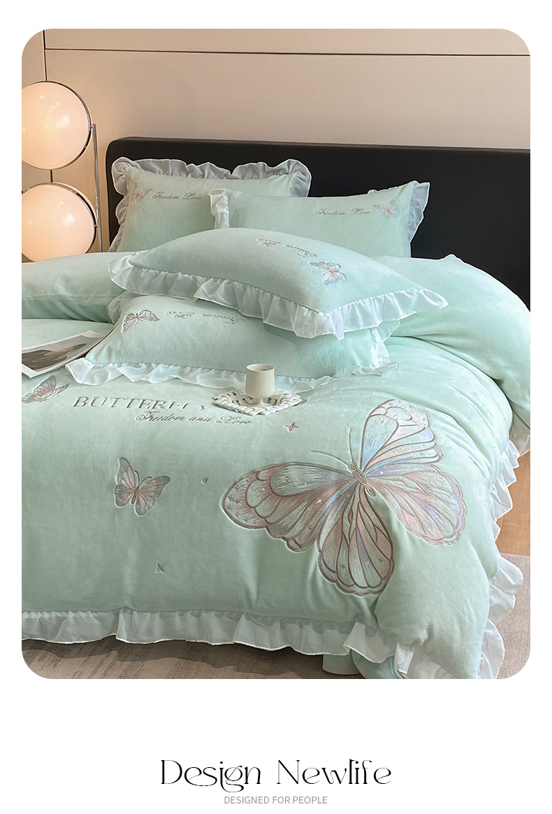 商品名称:木子家纺 2025新款牛奶绒纯色刺绣花边四件套 美蝶绿