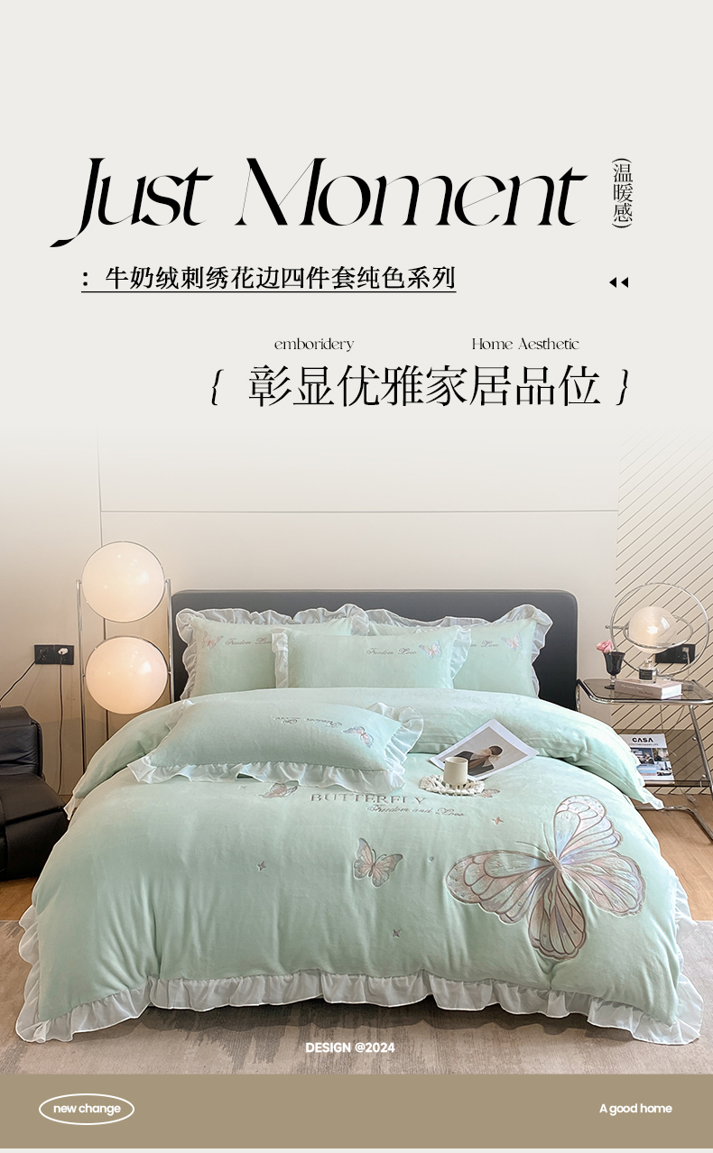 木子家纺 2025新款牛奶绒纯色刺绣花边四件套 美蝶绿