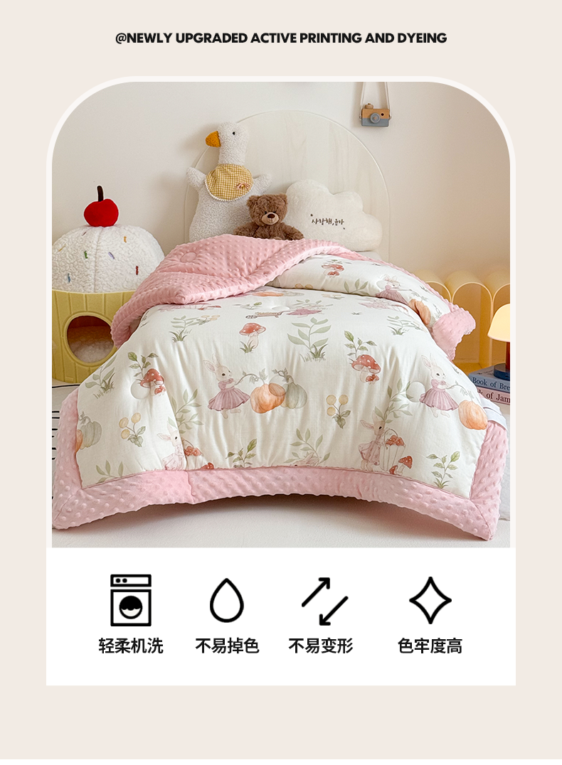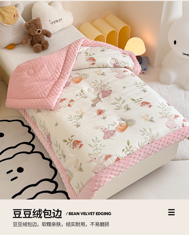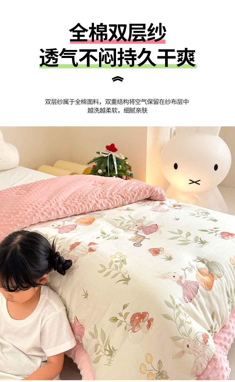 (总)嗨生活 2025新款全棉双层纱豆豆被 儿童被 春秋被 冬被 幼儿园被子,草莓兔兔,花丛小兔,米菲兔,汽车乐园,挖机恐龙,玩具屋,小海豚,熊猫盼盼