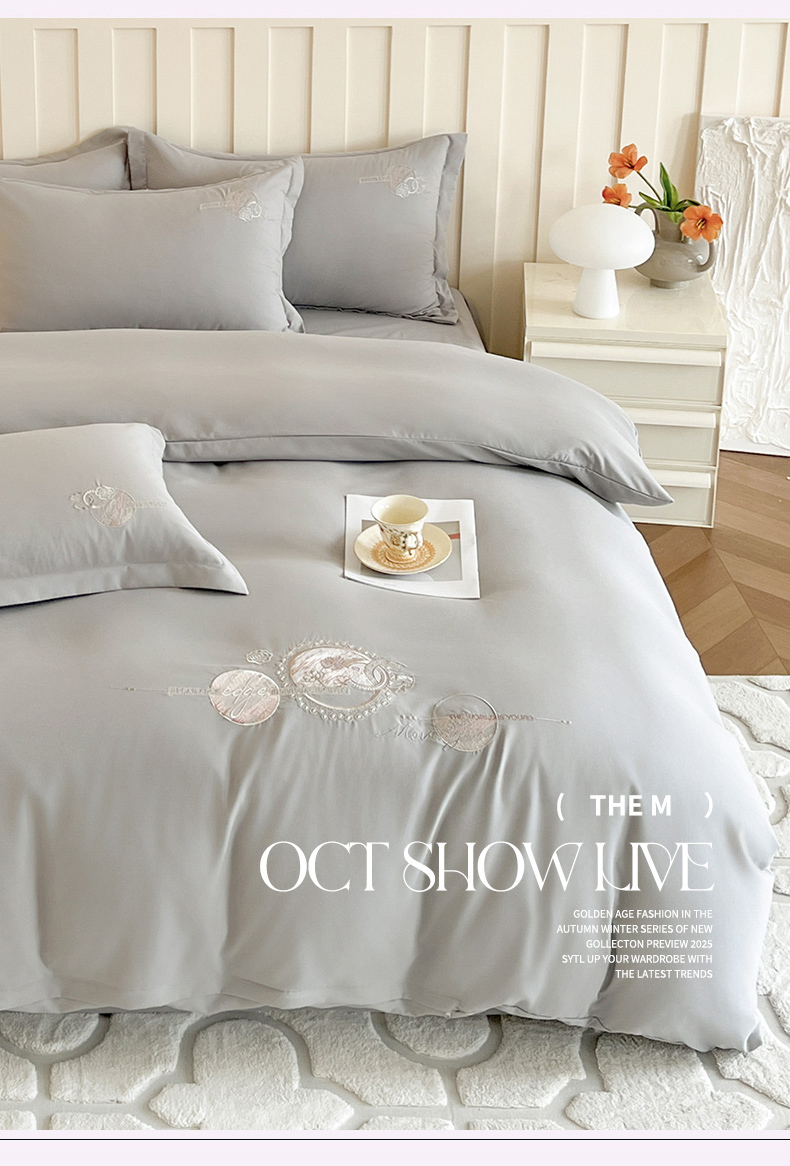 文黛家居 2025新款高克重水洗棉绣花四件套-奢侈生活 奢侈生活-灰