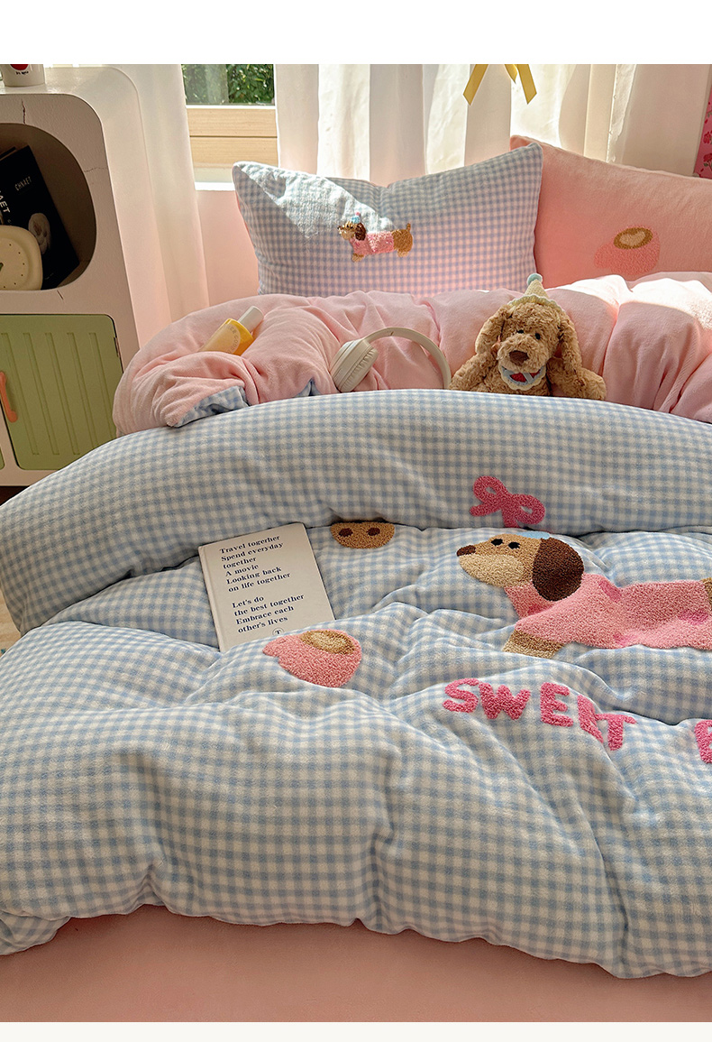 (总)顾里家纺 2024新款韩系腊肠狗毛巾绣牛奶绒四件套,粉格腊肠狗,黄格腊肠狗,咖格腊肠狗,蓝格腊肠狗,绿格腊肠狗