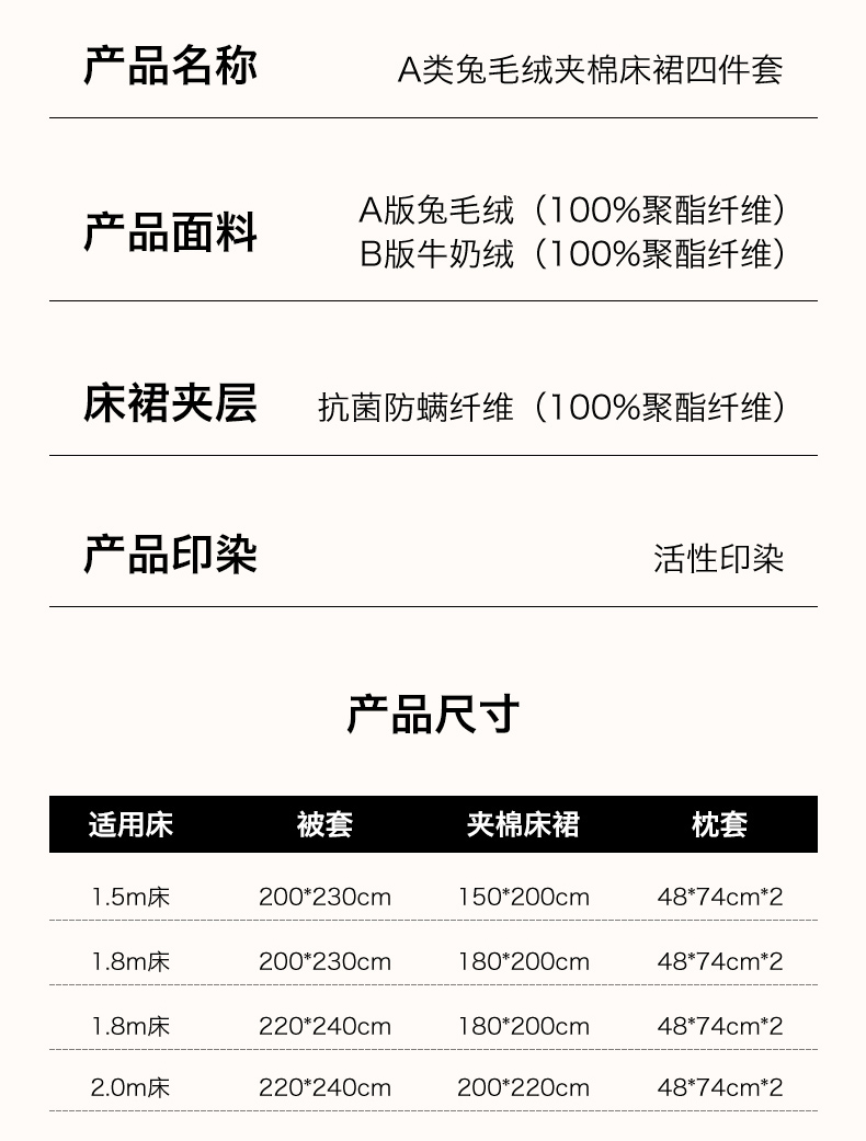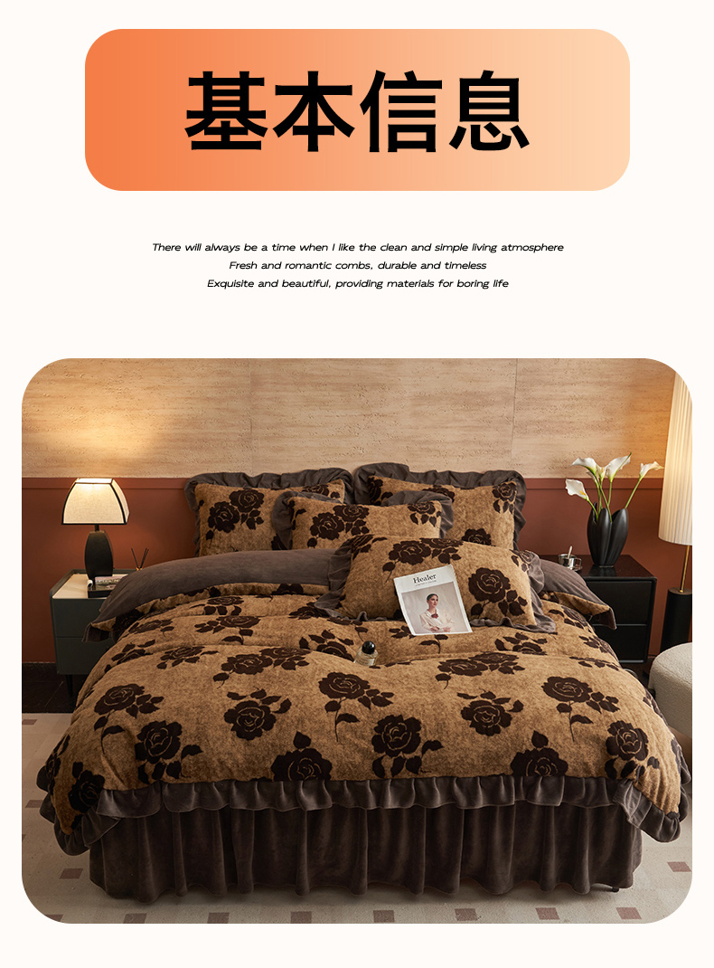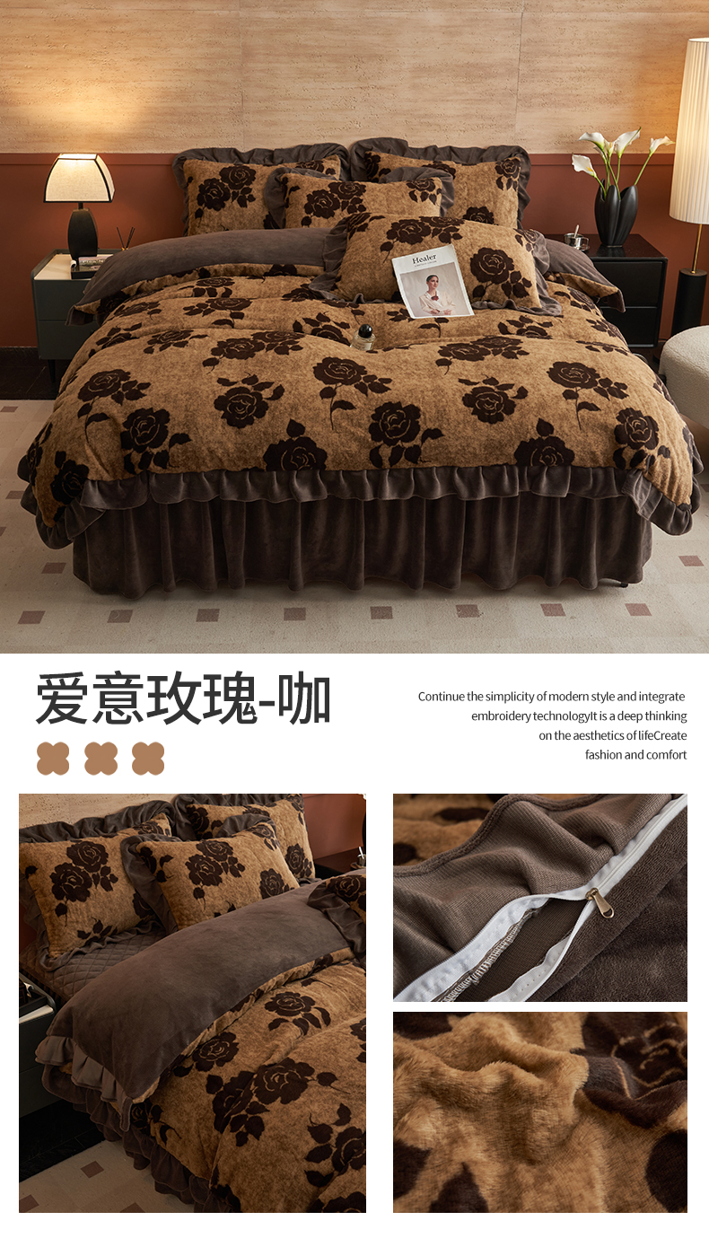 商品名称:金鹰 2025新款A类兔毛绒夹棉床裙四件套加厚牛奶绒四件套 爱意玫瑰-咖