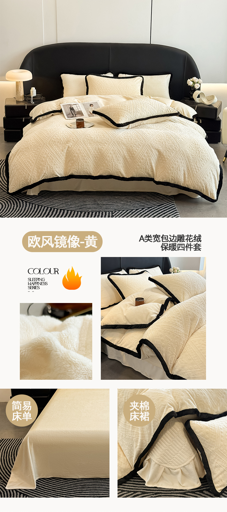 当前位置: 91家纺网 > 商品网购 > 床品套件 > 四件套 > 其它四件套 > 懒猫家纺 2025新款宽包边雕花绒四件套 欧风镜像-黄