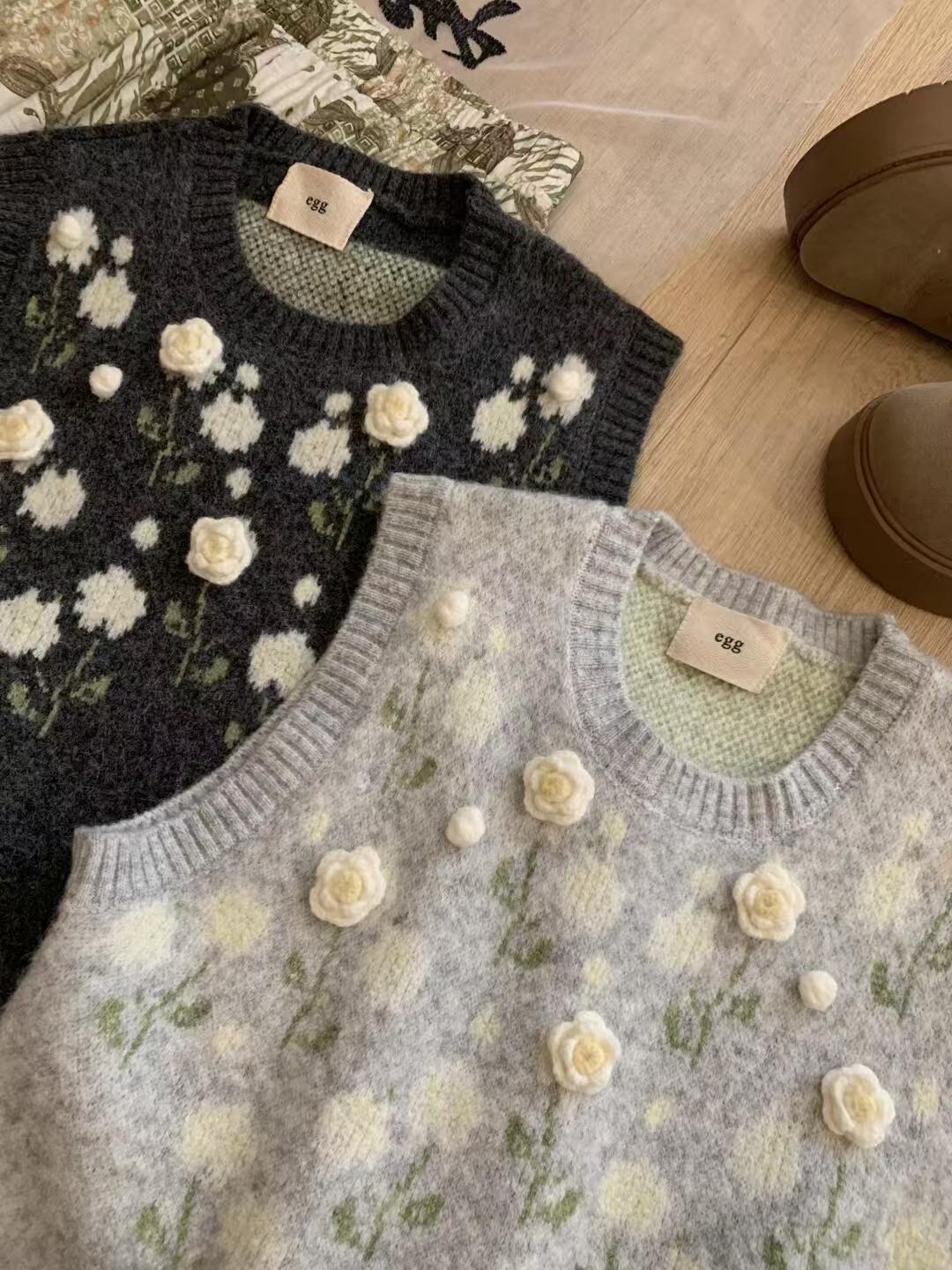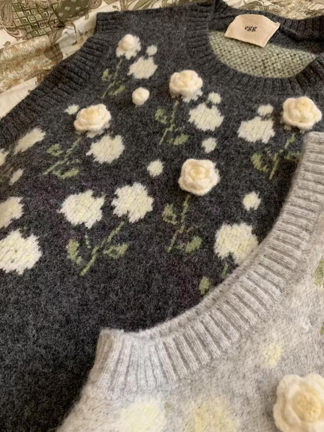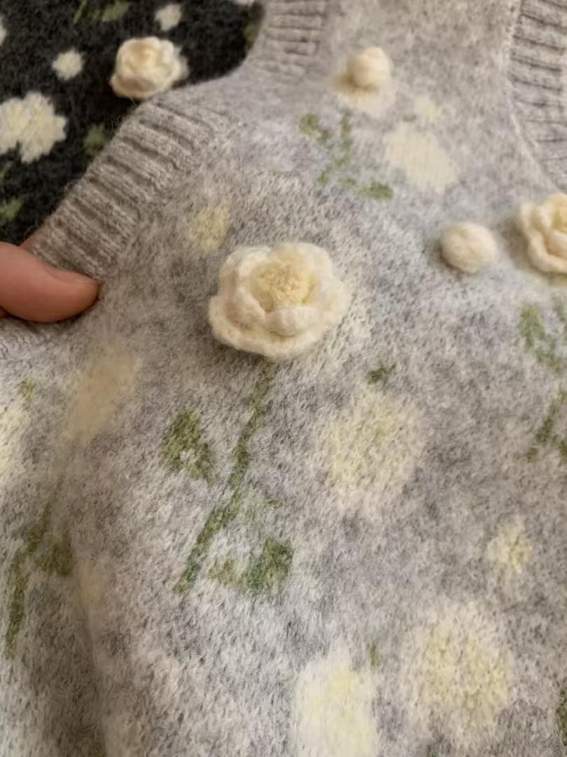 (总)洛兰沙家居馆 只代发小香风毛衣女春秋慵懒可爱甜美圆领花朵针织开衫短款外套温柔上衣