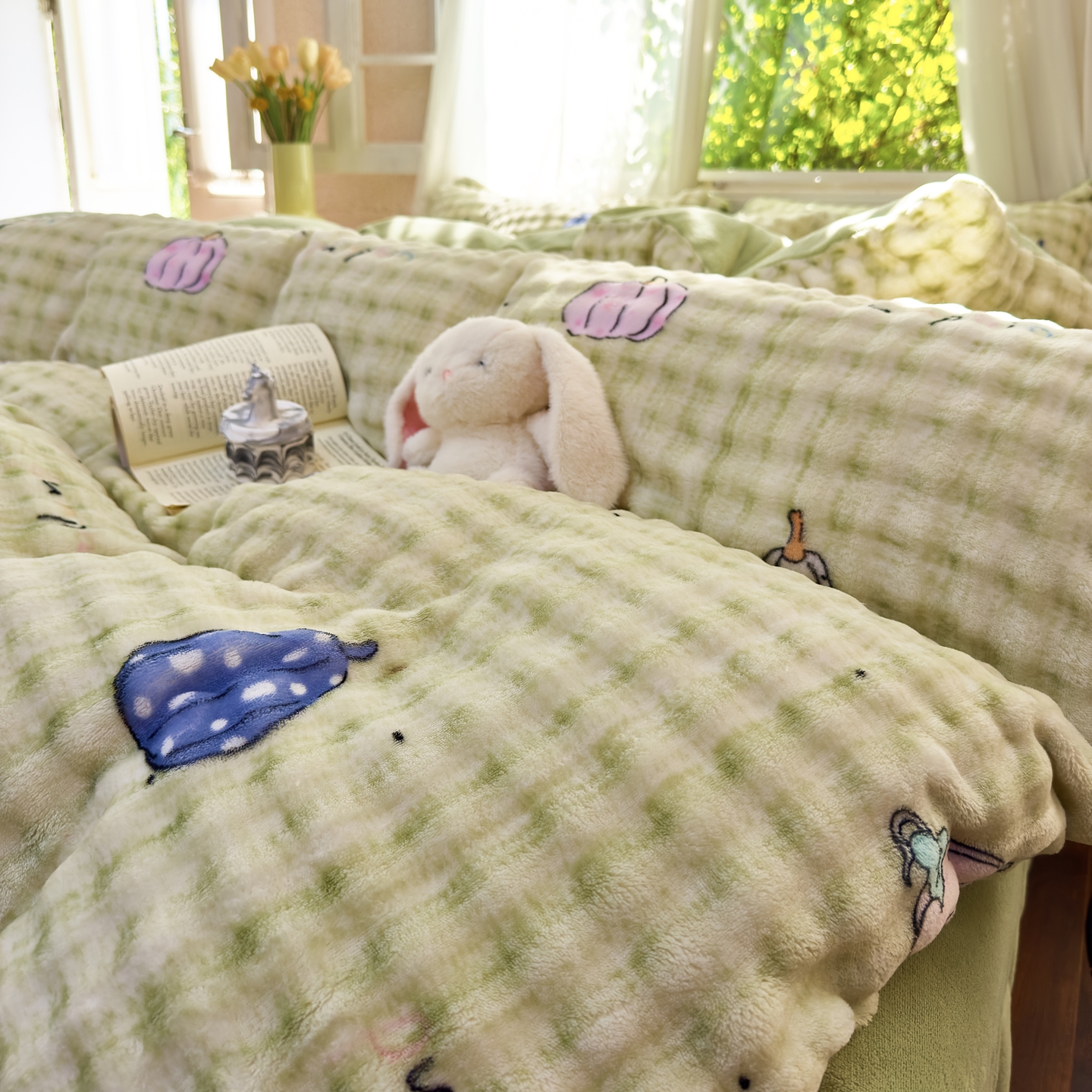 (总)梦莱斯 2025新款泡泡绒豆豆绒加厚牛奶绒四件套 - 印花系列,蝶影粉,赫本蝴蝶,花妖,咖色蝴蝶结,顽皮熊,星空黄,熊猫绿,炫彩紫,字母爱心