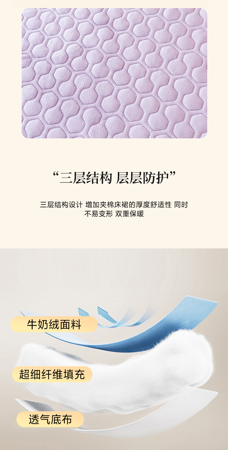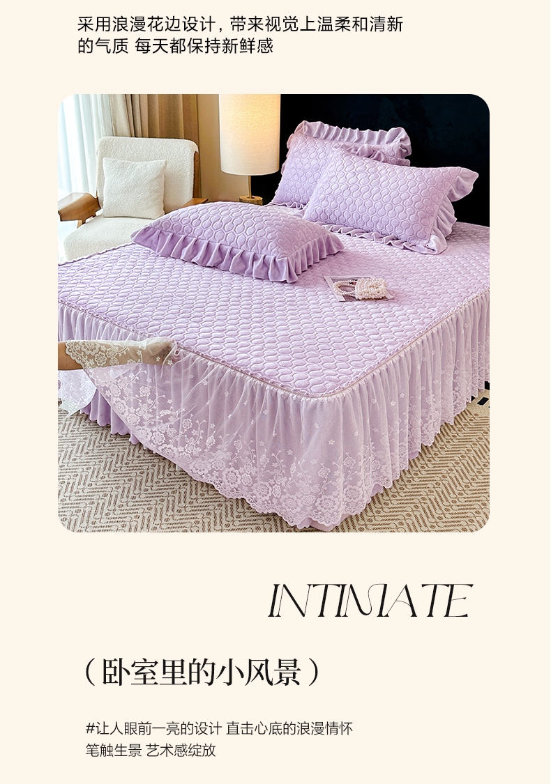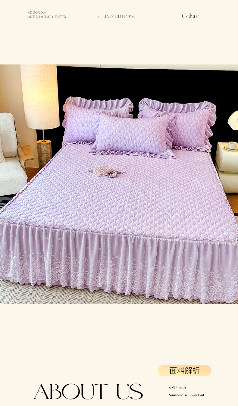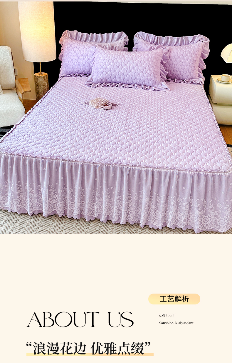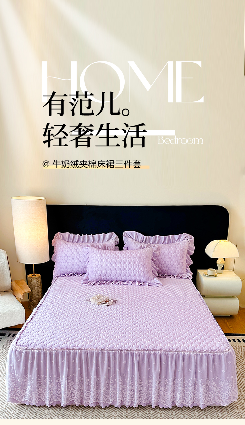 当前位置: 91家纺网 > 商品网购 > 床品套件 > 三件套 > 民新家纺 2025新款牛奶绒夹棉床裙三件套 浪漫时光-浅紫