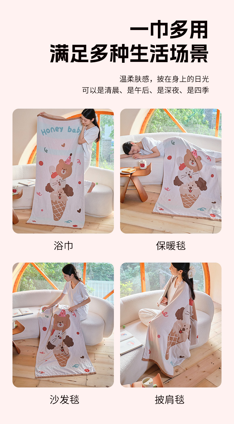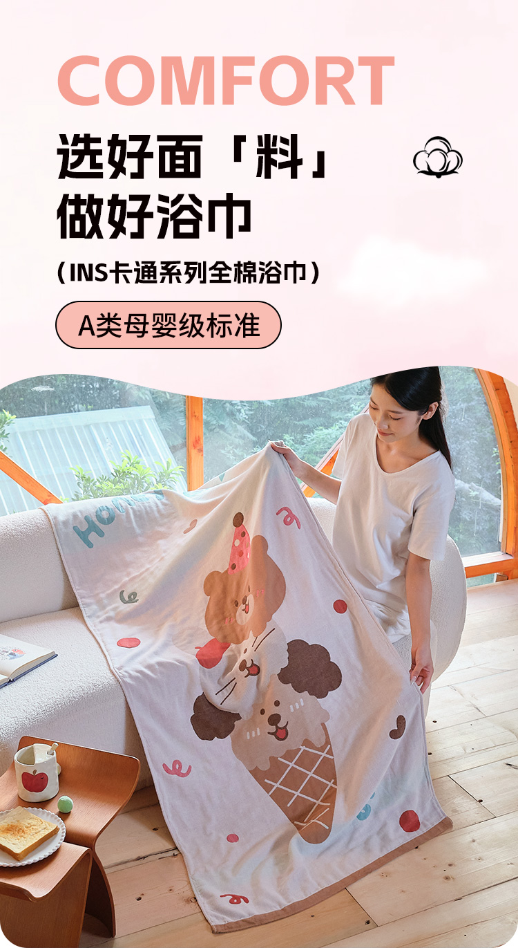 当前位置: 91家纺网 > 商品网购 > 居家日用 > 毛巾/浴巾/浴袍 > 浴巾 > 沐瑟家纺 2025新款卡通A类全棉四层纱布浴巾加大毛巾-第一组 甜蜜宝贝 80*160cm