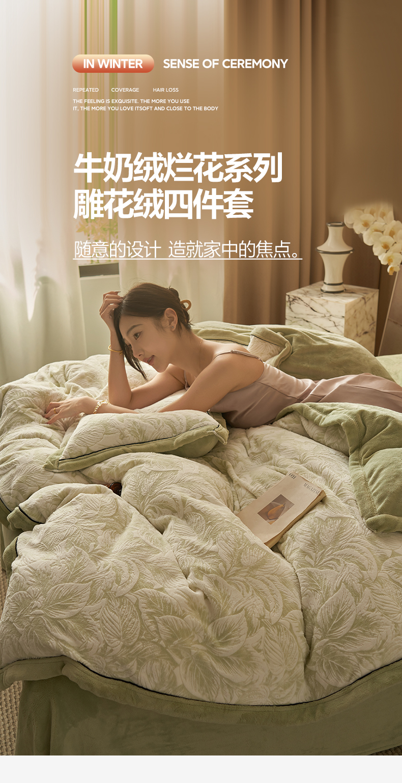 当前位置: 91家纺网 > 商品网购 > 床品套件 > 四件套 > 其它四件套 > 晨曦家纺 2025新款牛奶绒浪花四件套雕花绒床上四件套 夜影漫眠
