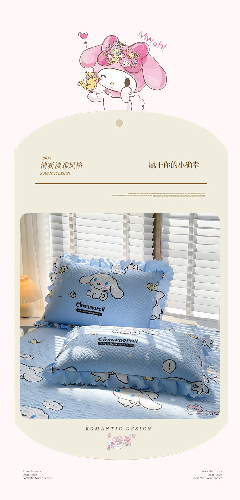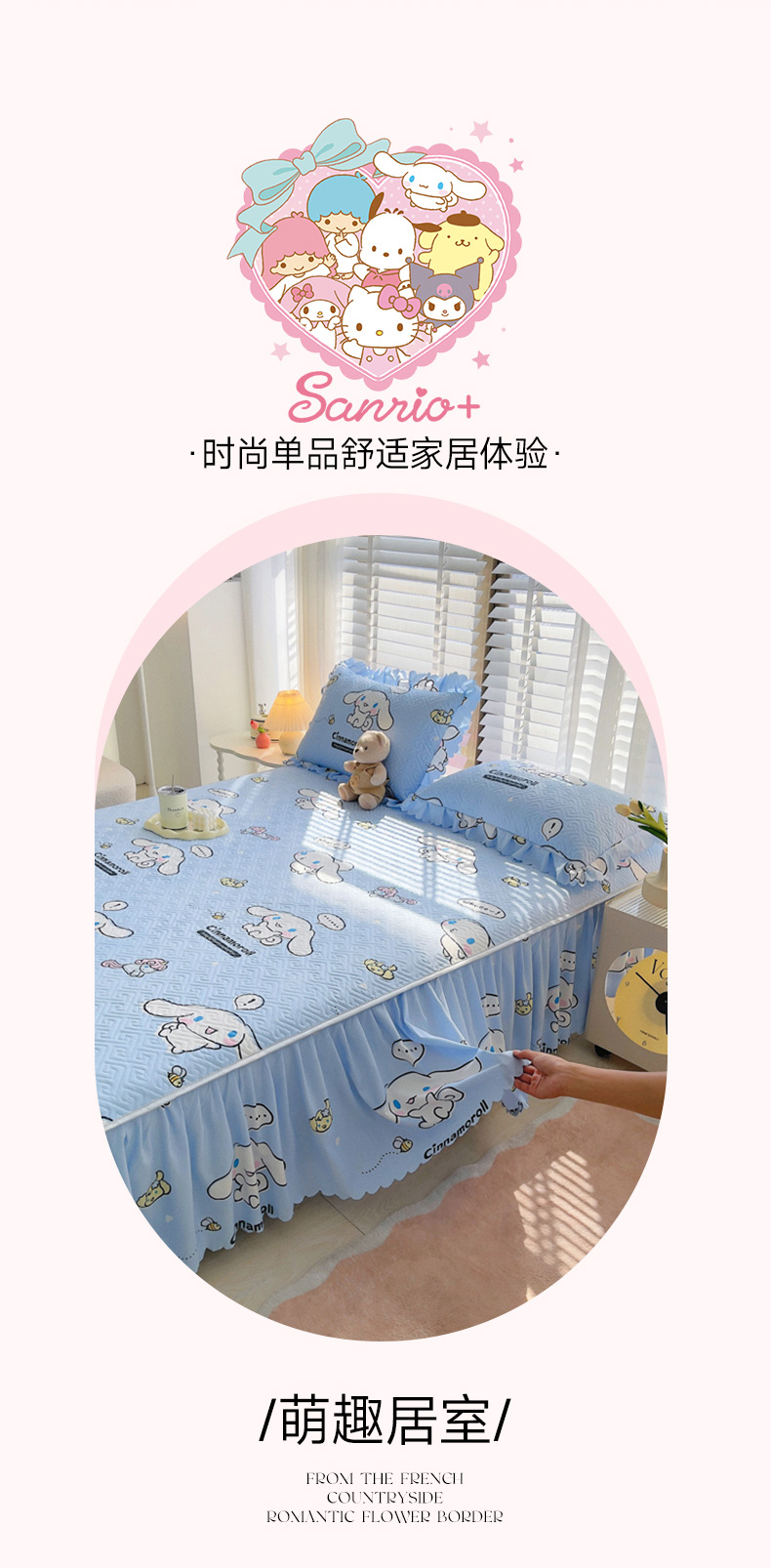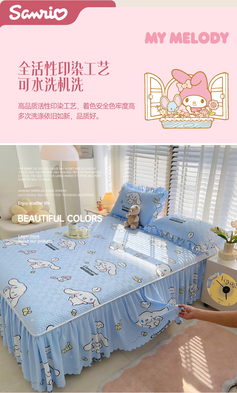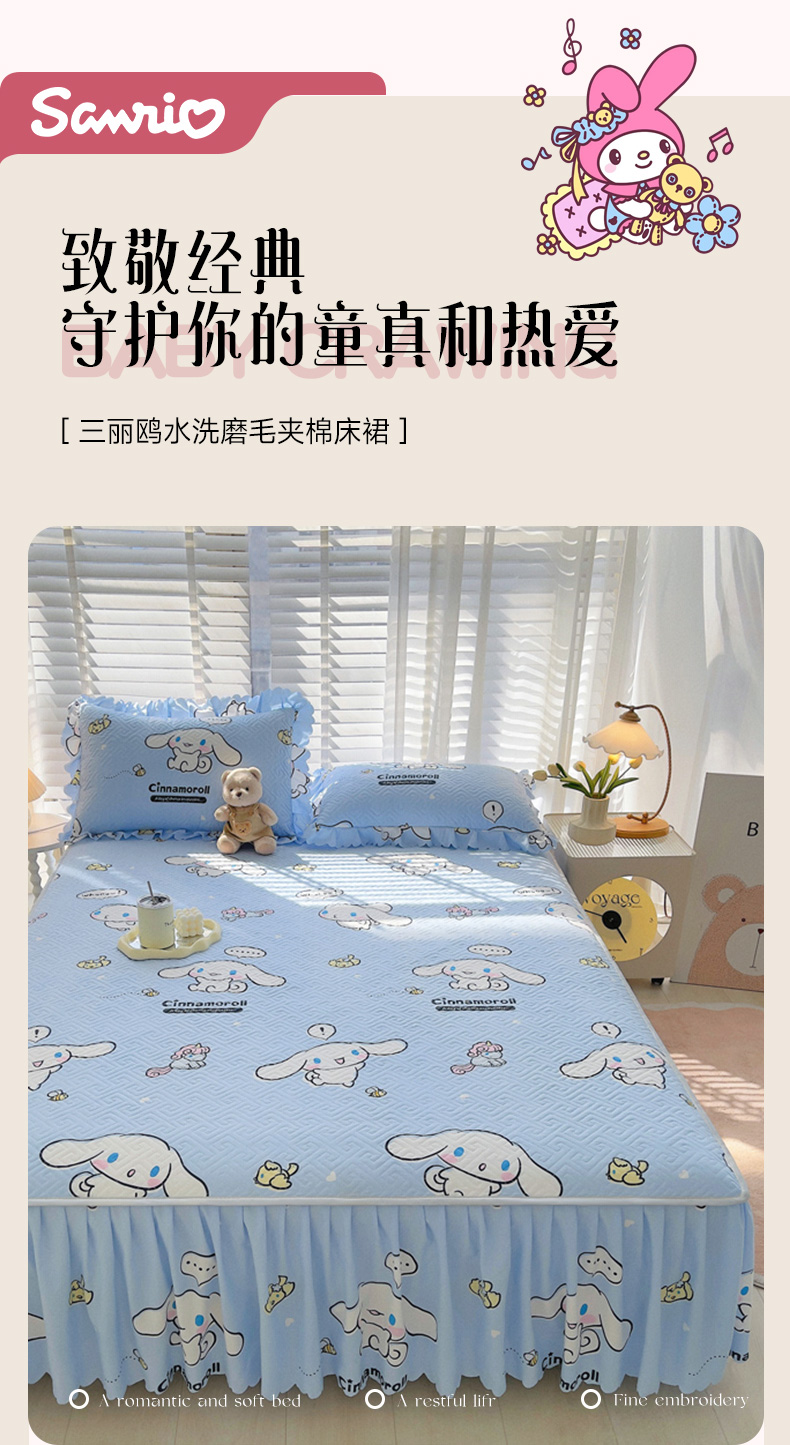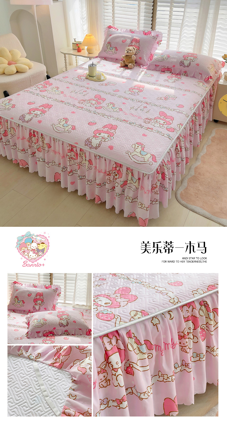 (总)艾兜坊 2025新款三丽鸥水洗棉夹棉床裙,爱心库洛米,草莓美乐蒂,幻影库洛米,木马美乐蒂,木马玉桂狗,樱桃库洛米